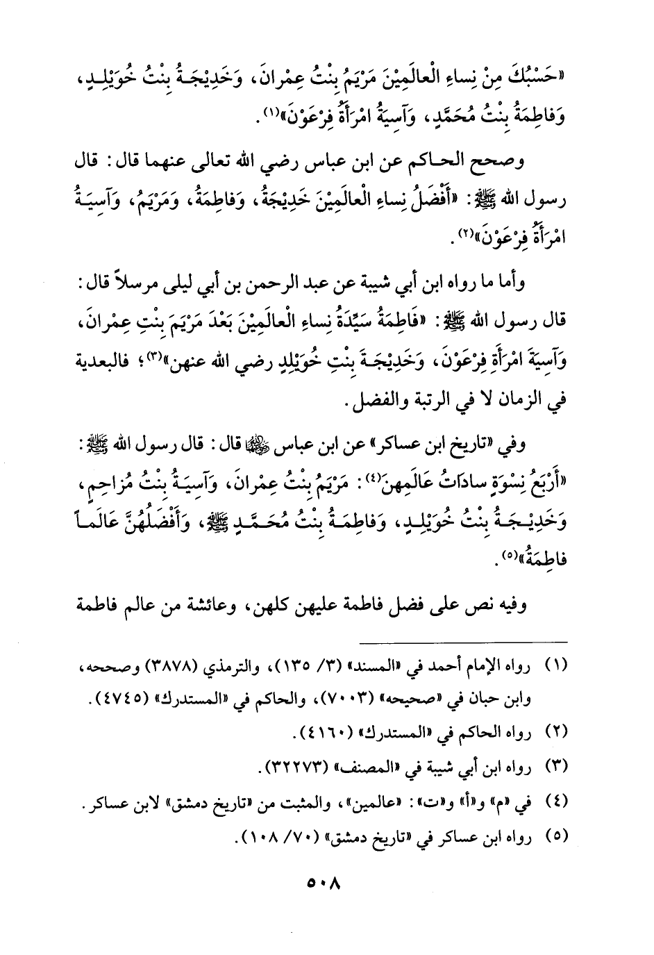 وصحح الحاكم عن ابن عباس رضي الله تعالى عنهما قال: قال رسول الله - صلى الله عليه وسلم -: "أَفْضَلُ نِساءِ الْعالَمِيْنَ خَدِيْجَةُ، وَفاطِمَةُ، وَمَرْيَمُ، وَآسِيَةُ امْرَأةُ فِرْعَوْنَ" (¬2).
