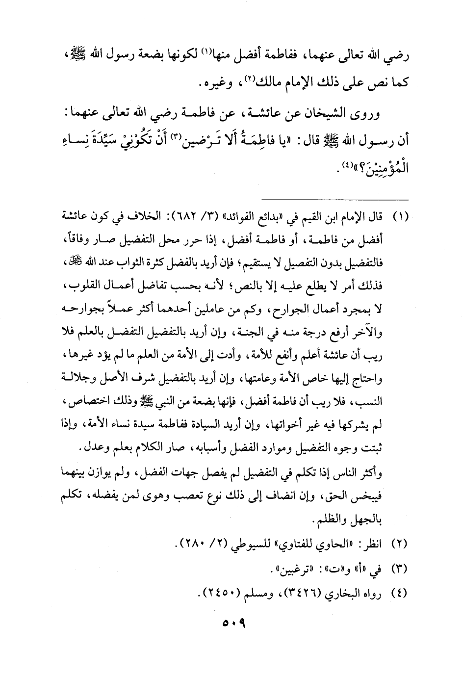 فالتفضيل بدون التفصيل لا يستقيم؛ فإن أريد بالفضل كثرة الثواب عند الله - عزوجل -، فذلك أمر لا يطلع عليه إلا بالنص؛ لأنه بحسب تفاضل أعمال القلوب، لا بمجرد أعمال الجوارح، وكم من عاملين أحدهما أكثر عملاً بجوارحه والآخر أرفع درجة منه في الجنة، وإن أريد بالتفضيل التفضل بالعلم فلا ريب أن عائشة أعلم وأنفع للأمة، وأدت إلى الأمة من العلم ما لم يؤد غيرها، واحتاج إليها خاص الأمة وعامتها، وإن أريد بالتفضيل شرف الأصل وجلالة النسب، فلا ريب أن فاطمة أفضل، فإنها بضعة من النبي - صلى الله عليه وسلم - وذلك اختصاص، لم يشركها فيه غير أخواتها، وإن أريد السيادة ففاطمة سيدة نساء الأمة، وإذا ثبتت وجوه التفضيل وموارد الفضل وأسبابه، صار الكلام بعلم وعدل.