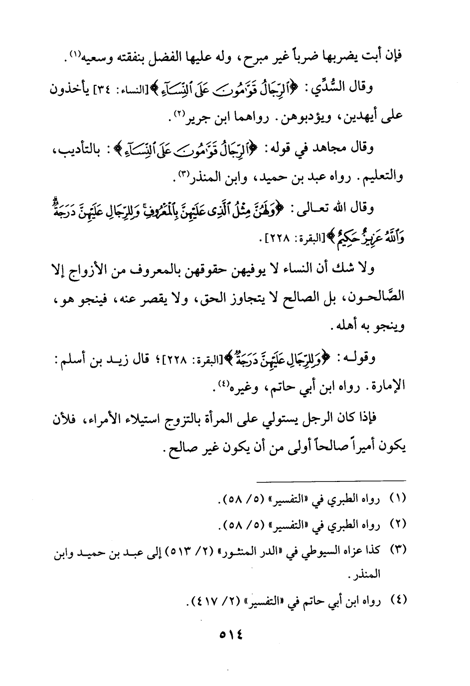 وقوله: {وَلِلرِّجَالِ عَلَيْهِنَّ دَرَجَةٌ} [البقرة: 228]؛ قال زيد بن أسلم: الإمارة. رواه ابن أبي حاتم، وغيره (¬4).
