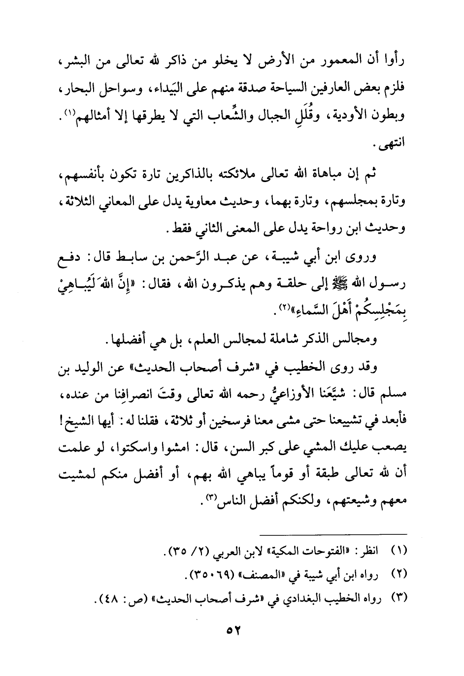 ثم إن مباهاة الله تعالى ملائكته بالذاكرين تارة تكون بأنفسهم، وتارة بمجلسهم، وتارة بهما، وحديث معاوية يدل على المعاني الثلاثة، وحديث ابن رواحة يدل على المعنى الثاني فقط.