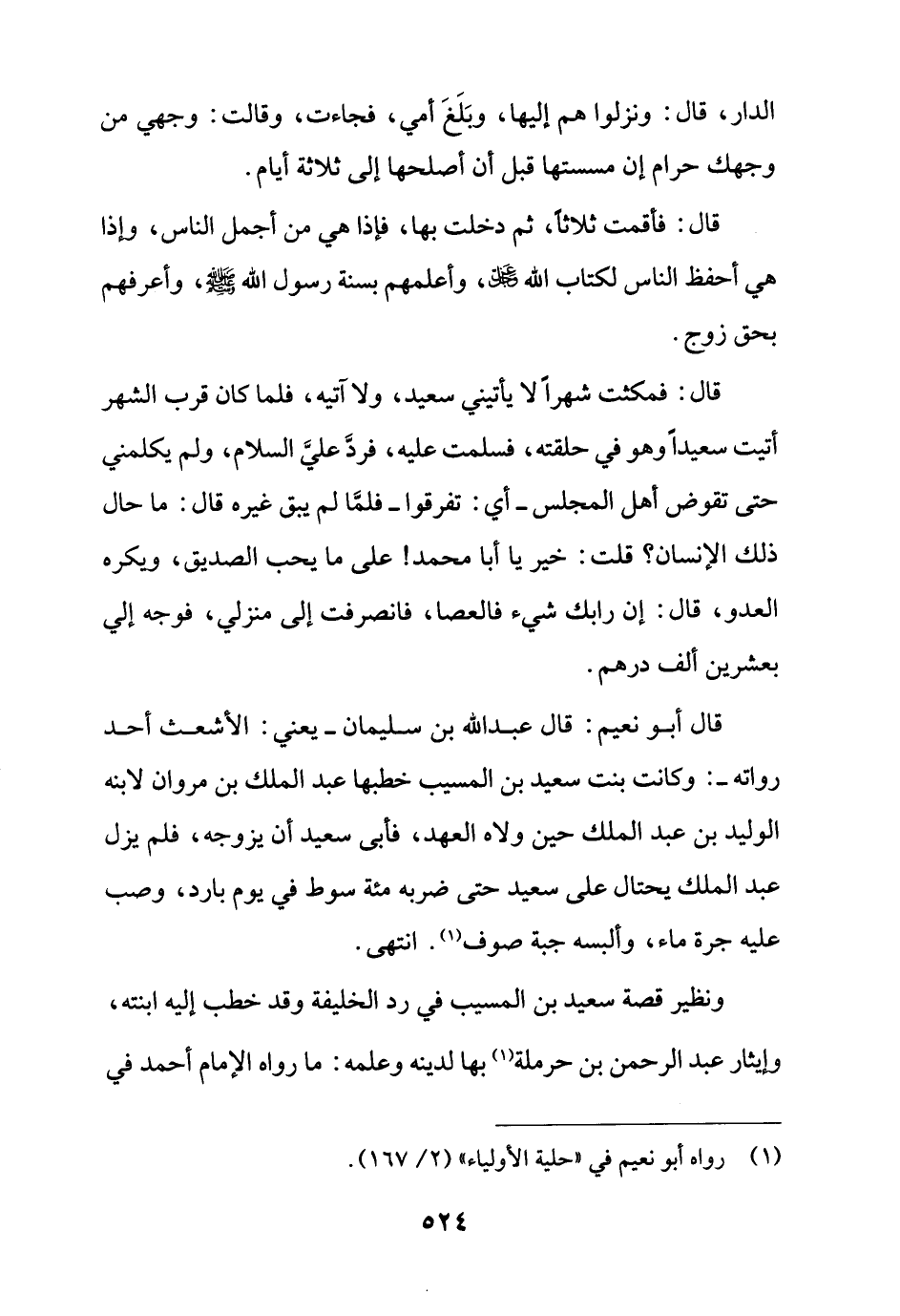قال أبو نعيم: قال عبد الله بن سليمان - يعني: الأشعث أحد رواته -: وكانت بنت سعيد بن المسيب خطبها عبد الملك بن مروان لابنه الوليد بن عبد الملك حين ولاه العهد، فأبى سعيد أن يزوجه، فلم يزل عبد الملك يحتال على سعيد حتى ضربه مئة سوط في يوم بارد، وصب عليه جرة ماء، وألبسه جبة صوف (¬1). انتهى.