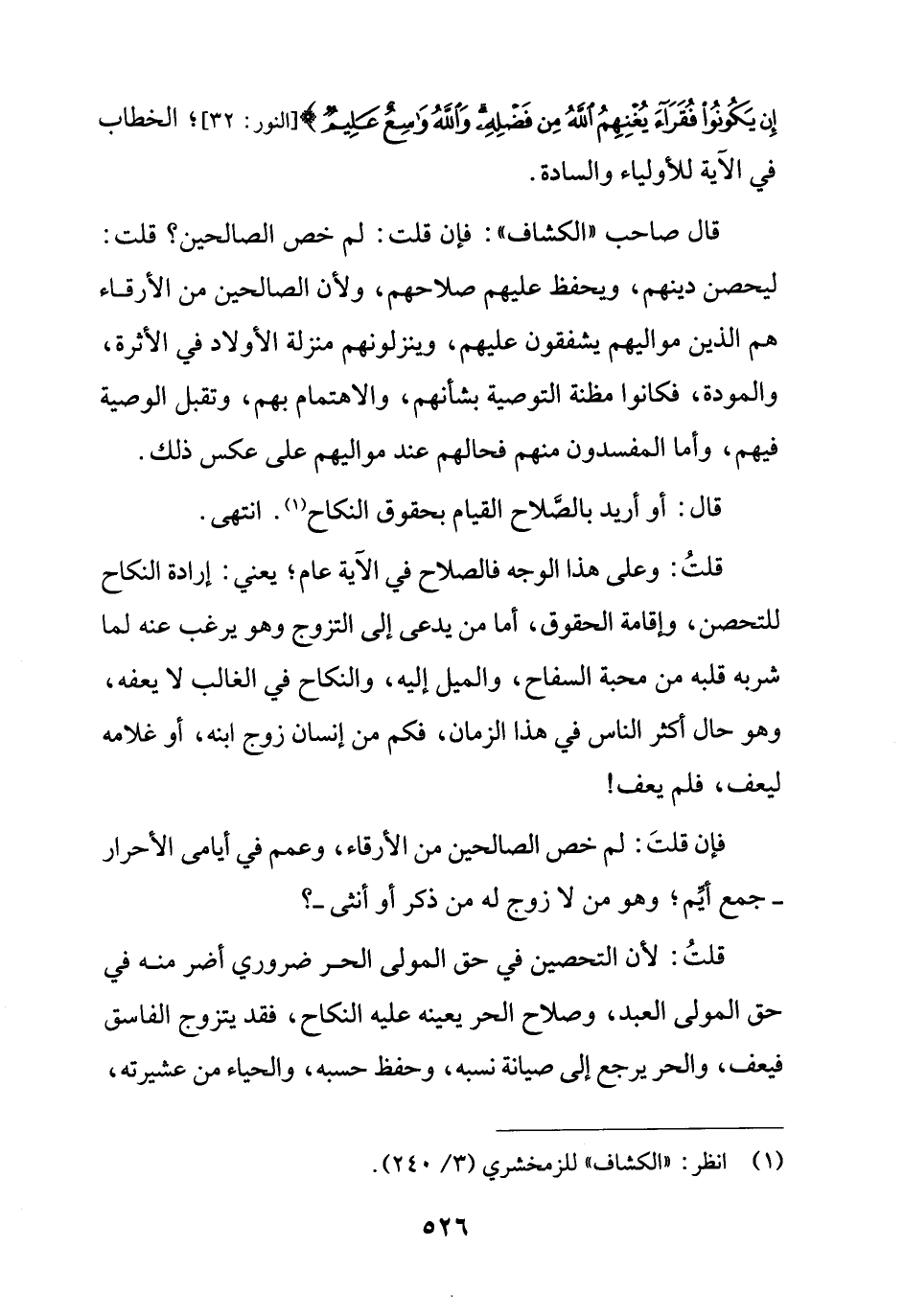 فإن قلتَ: لم خص الصالحين من الأرقاء، وعمم في أيامى الأحرار -جمع أيِّم؛ وهو من لا زوج له من ذكر أو أنثى-؟