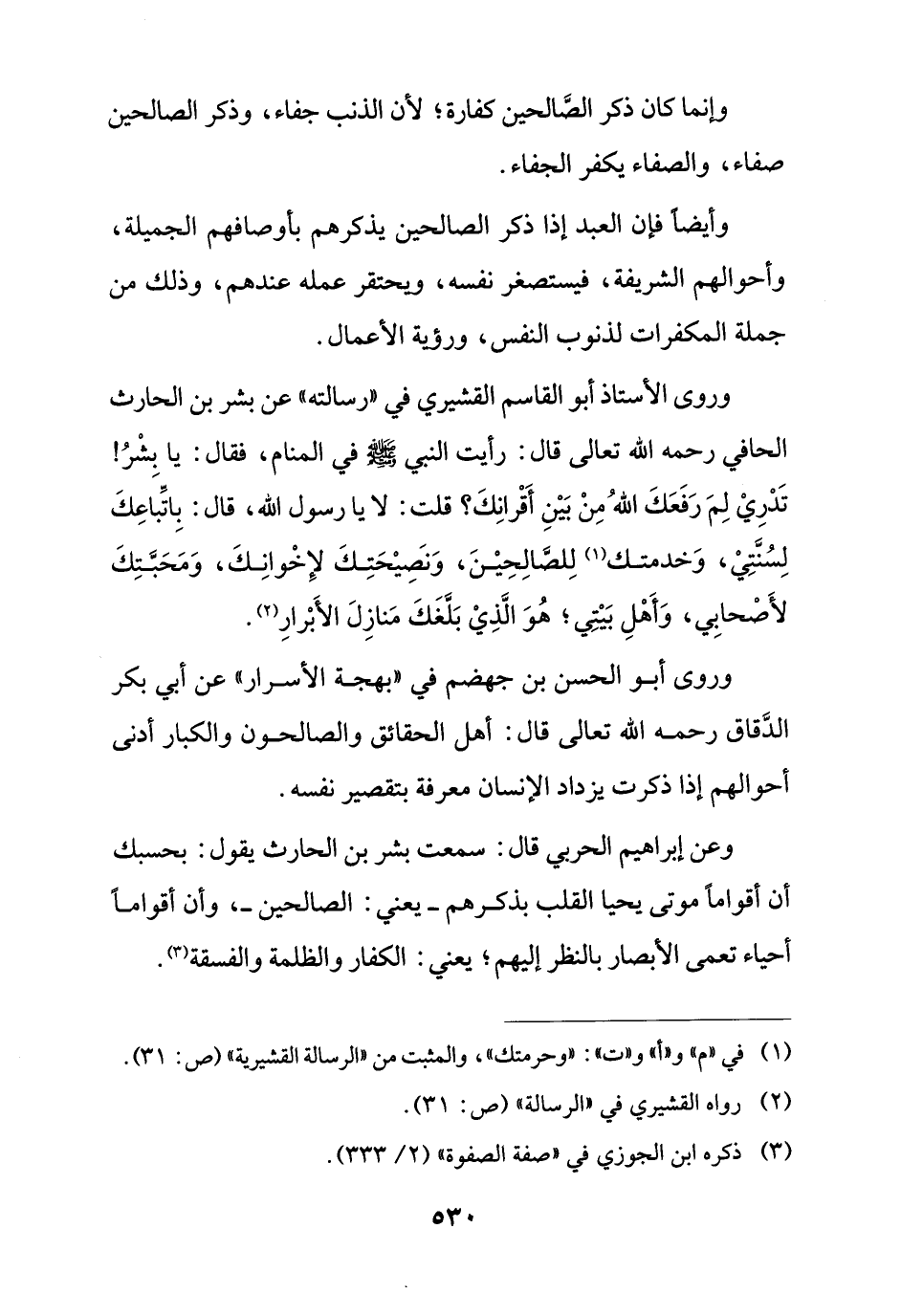 وروى الأستاذ أبو القاسم القشيري في "رسالته" عن بشر بن الحارث الحافي رحمه الله تعالى قال: رأيت النبي -صلى الله عليه وسلم- في المنام، فقال: يا بِشْرُ! تَدْرِيْ لِمَ رَفَعَكَ اللهُ مِنْ بَيْنِ أَقْرانِكَ؟ قلت: لا يا رسول الله، قال: بِاتِّباعِكَ لِسُنَّتِيْ، وَخدمتك (¬1) لِلصَّالِحِيْنَ، وَنَصِيْحَتِكَ لإِخْوانِكَ، وَمَحَبَّتِكَ لأَصْحابِي، وَأَهْلِ بَيْتِي؛ هُوَ الَّذِيْ بَلَّغَكَ مَنازِلَ الأَبْرارِ (¬2).