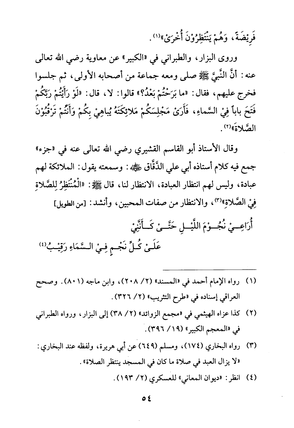 وقال الأستاذ أبو القاسم القشيري رضي الله تعالى عنه في "جزء" جمع فيه كلام أستاذه أبي علي الدَّقَّاق - رضي الله عنه -: وسمعته يقول: الملائكة لهم عبادة، وليس لهم انتظار العبادة، الانتظار لنا، قال - صلى الله عليه وسلم -: "الْمُنتظِرُ لِلصَّلاةِ فِيْ الصَّلاةِ" (¬3)، والانتظار من صفات المحبين، وأنشد: [من الطويل]
