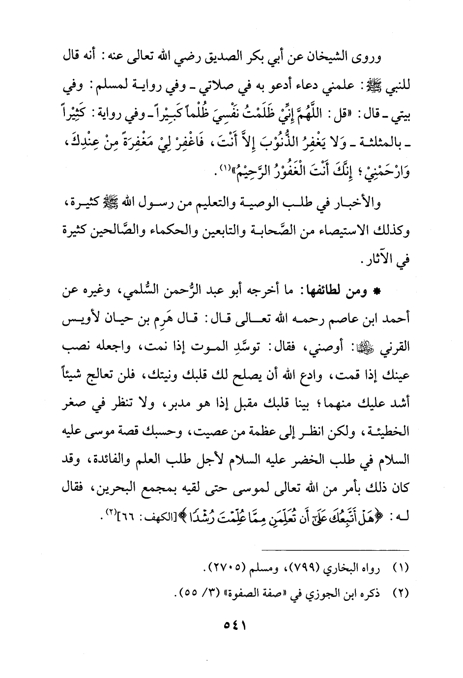 * ومن لطائفها: ما أخرجه أبو عبد الرُّحمن السُّلمي، وغيره عن أحمد ابن عاصم رحمه الله تعالى قال: قال هَرِم بن حيان لأويس القرني -رضي الله عنهما-: أوصني، فقال: توسَّدِ الموت إذا نمت، واجعله نصب عينك إذا قمت، وادع الله أن يصلح لك قلبك ونيتك، فلن تعالج شيئاً أشد عليك منهما؛ بينا قلبك مقبل إذا هو مدبر، ولا تنظر في صغر الخطيئة، ولكن انظر إلى عظمة من عصيت، وحسبك قصة موسى عليه السلام في طلب الخضر عليه السلام لأجل طلب العلم والفائدة، وقد كان ذلك بأمر من الله تعالى لموسى حتى لقيه بمجمع البحرين، فقال له: {هَلْ أَتَّبِعُكَ عَلَى أَنْ تُعَلِّمَنِ مِمَّا عُلِّمْتَ رُشْدًا} [الكهف: 66] (¬2)