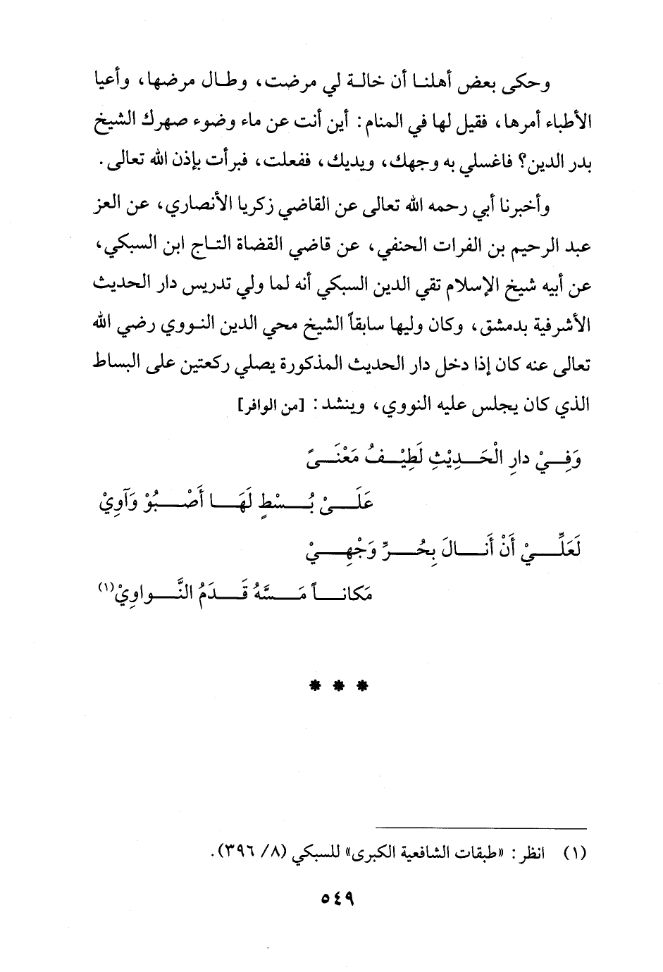 وأخبرنا أبي رحمه الله تعالى عن القاضي زكريا الأنصاري، عن العز عبد الرحيم بن الفرات الحنفي، عن قاضي القضاة التاج ابن السبكي، عن أبيه شيخ الإسلام تقي الدين السبكي أنه لما ولي تدريس دار الحديث الأشرفية بدمشق، وكان وليها سابقاً الشيخ محي الدين النووي رضي الله تعالى عنه كان إذا دخل دار الحديث المذكورة يصلي ركعتين على البساط الذي كان يجلس عليه النووي، وينشد: [من الوافر]