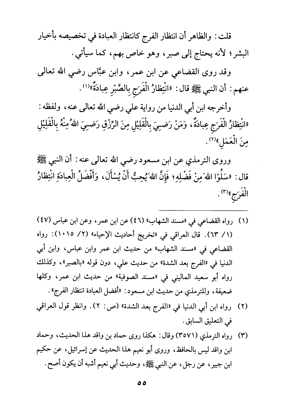 وقد روى القضاعي عن ابن عمر، وابن عبَّاس رضي الله تعالى عنهم: أن النبي - صلى الله عليه وسلم - قال: "انْتِظارُ الْفَرَجِ بِالصَّبْرِ عِبادةٌ" (¬1).