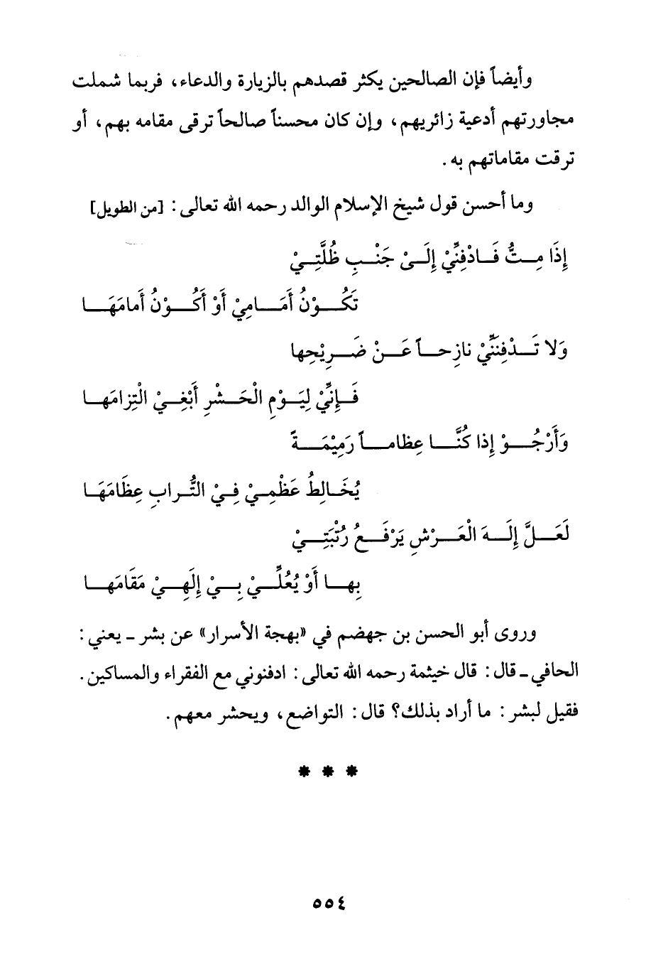 وروى أبو الحسن بن جهضم في "بهجة الأسرار" عن بشر -يعني: الحافي- قال: قال خيثمة رحمه الله تعالى: ادفنوني مع الفقراء والمساكين.