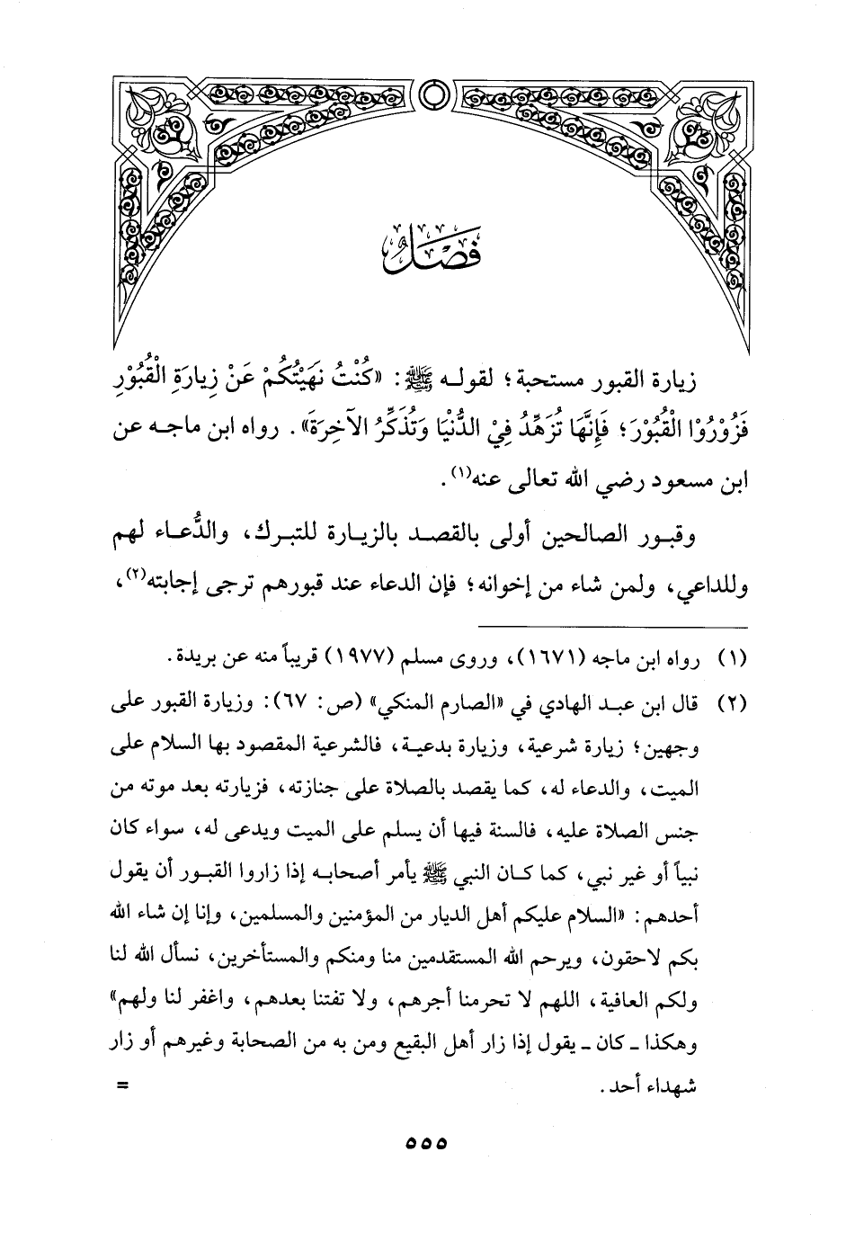 (¬2) قال ابن عبد الهادي في "الصارم المنكي" (ص: 67): وزيارة القبور على وجهين؛ زيارة شرعية، وزيارة بدعية، فالشرعية المقصود بها السلام على الميت، والدعاء له، كما يقصد بالصلاة على جنازته، فزيارته بعد موته من جنس الصلاة عليه، فالسنة فيها أن يسلم على الميت ويدعى له، سواء كان نبياً أو غير نبي، كما كان النبي -صلى الله عليه وسلم- يأمر أصحابه إذا زاروا القبور أن يقول أحدهم: "السلام عليكم أهل الديار من المؤمنين والمسلمين، وإنا إن شاء الله بكم لاحقون، ويرحم الله المستقدمين منا ومنكم والمستأخرين، نسأل الله لنا ولكم العافية، اللهم لا تحرمنا أجرهم، ولا تفتنا بعدهم، واغفر لنا ولهم" وهكذا -كان- يقول إذا زار أهل البقيع ومن به من الصحابة وغيرهم أو زار شهداء أحد. =