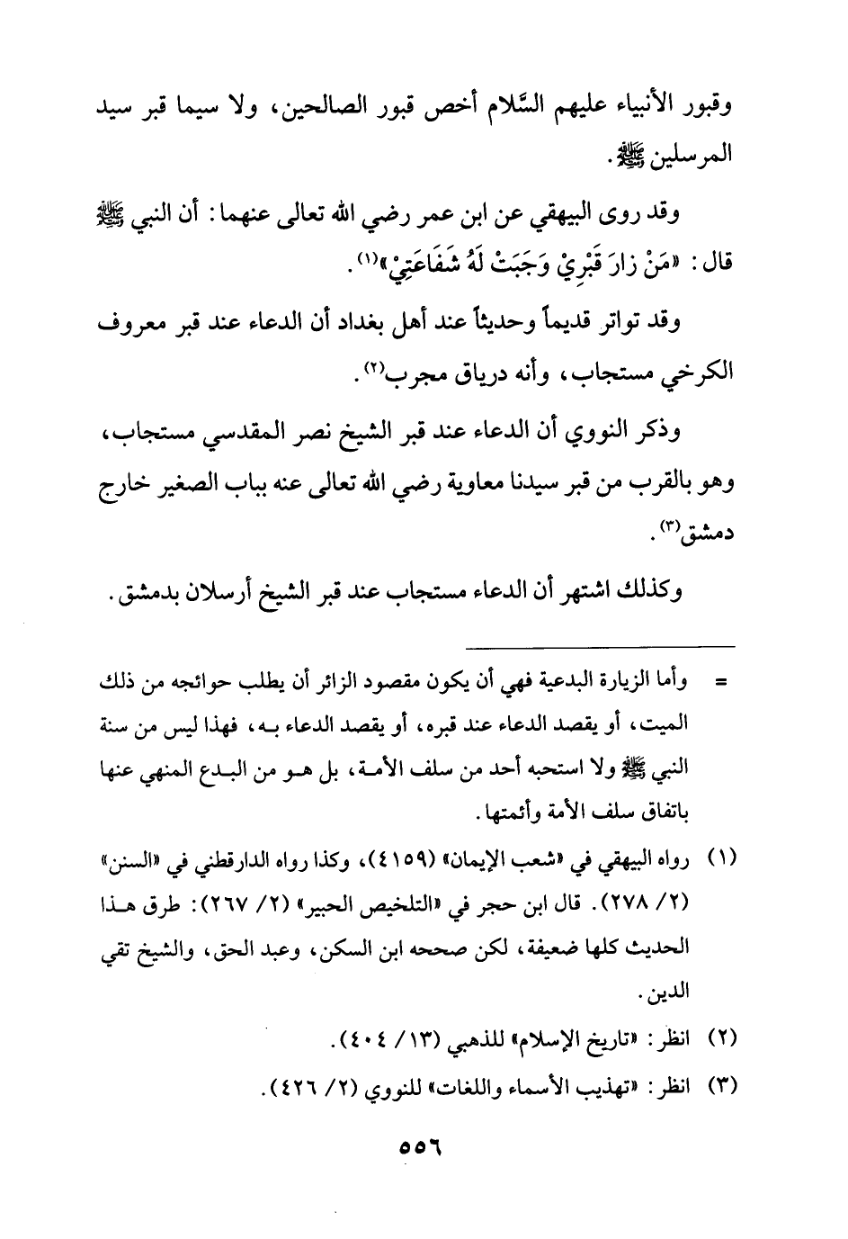 وذكر النووي أن الدعاء عند قبر الشيخ نصر المقدسي مستجاب، وهو بالقرب من قبر سيدنا معاوية رضي الله تعالى عنه بباب الصغير خارج دمشق (¬3).