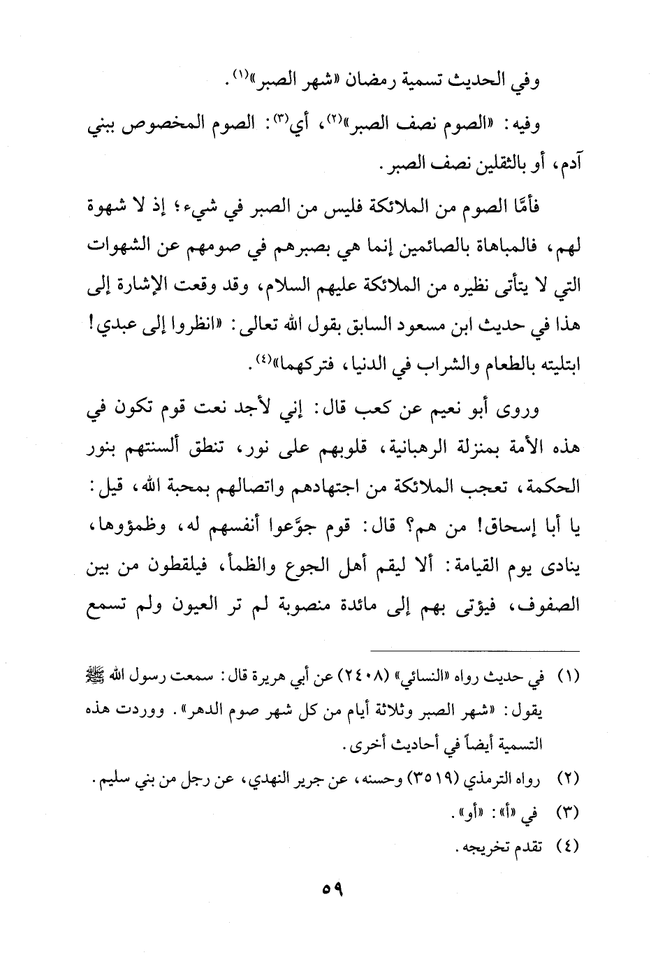 فأمَّا الصوم من الملائكة فليس من الصبر في شيء؛ إذ لا شهوة لهم، فالمباهاة بالصائمين إنما هي بصبرهم في صومهم عن الشهوات التي لا يتأتى نظيره من الملائكة عليهم السلام، وقد وقعت الإشارة إلى هذا في حديث ابن مسعود السابق يقول الله تعالى: "انظروا إلى عبدي! ابتليته بالطعام والشراب في الدنيا، فتركهما" (¬4).