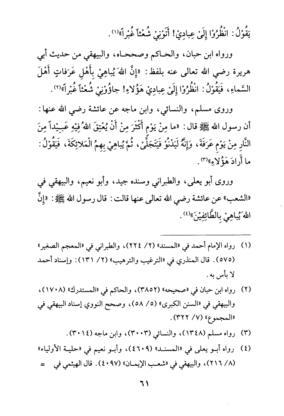 وروى مسلم، والنسائي، وابن ماجه عن عائشة رضي الله عنها: أن رسول الله - صلى الله عليه وسلم - قال: "ما مِنْ يَوْمٍ أَكْثَرَ مِنْ أَنْ يُعْتِقَ اللهُ فِيْهِ عَبِيْداً مِنَ النَّارِ مِنْ يَوْمِ عَرَفَةَ، وإِنَّهُ لَيَدْنُوْ فَيتَجَلَّىْ، ثُمَّ يُباهِيْ بِهِمُ الْمَلائِكَةَ، فَيَقُوْلُ: ما أَرادَ هَؤُلاءِ" (¬3).