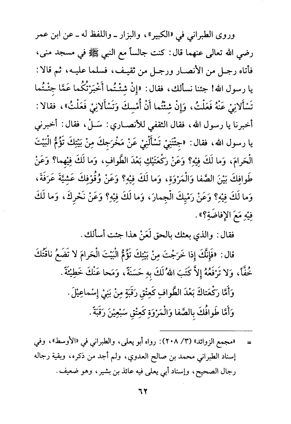 وروى الطبراني في "الكبير"، والبزار - واللفظ له - عن ابن عمر رضي الله تعالى عنهما قال: كنت جالساً مع النبي - صلى الله عليه وسلم - في مسجد منى، فأتاه رجل من الأنصار ورجل من ثقيف، فسلما عليه، ثم قالا: يا رسول الله! جئنا نسألك، فقال: "إِنْ شِئْتُما أَخْبَرْتُكُما عَمَّا جِئْتُما تَسْأَلانِيْ عَنْهُ فَعَلْتُ، وَإِنْ شِئتُما أَنْ أُمْسِكَ وَتَسْأَلانِيْ فَعَلْتُ"، فقالا: أخبرنا يا رسول الله، فقال الثقفي للأنصاري: سَلْ، فقال: أخبرني يا رسول الله، فقال: "جِئْتَنِيْ تَسْأَلنِيْ عَنْ مَخْرَجِكَ مِنْ بَيْتِكَ تَؤُمُّ الْبَيْتَ الْحَرامَ، وَما لَكَ فِيْه؟ وَعَنْ رَكْعَتَيْكِ بَعْدَ الطَّوافِ، وَما لَكَ فِيْهِما؟ وَعَنْ طَوافِكَ بَيْنَ الصَّفا وَالْمَرْوَةِ، وَما لَكَ فِيْه؟ وَعَنْ وُقُوْفِكَ عَشيَّةَ عَرَفَةَ، وَما لَكَ فِيْهِ؟ وَعَنْ رَمْيِكَ الْجِمارَ، وَما لَكَ فِيْهِ؟ وَعَنْ نَحْرِكَ، وَما لَكَ فِيْهِ مَعَ الإِفاضَةِ؟ ".