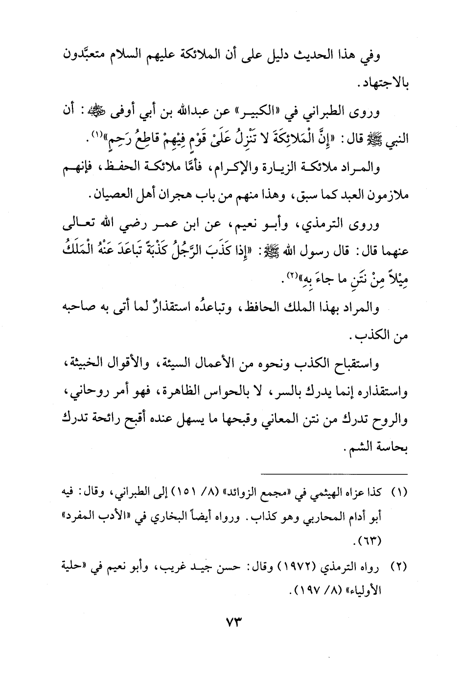 وروى الترمذي، وأبو نعيم، عن ابن عمر رضي الله تعالى عنهما قال: قال رسول الله - صلى الله عليه وسلم -: "إِذا كَذَبَ الرَّجُلُ كَذْبَة تَباعَدَ عَنْهُ الْمَلَكُ مِيْلاً مِنْ نتَنِ ما جاءَ بِهِ" (¬2).
