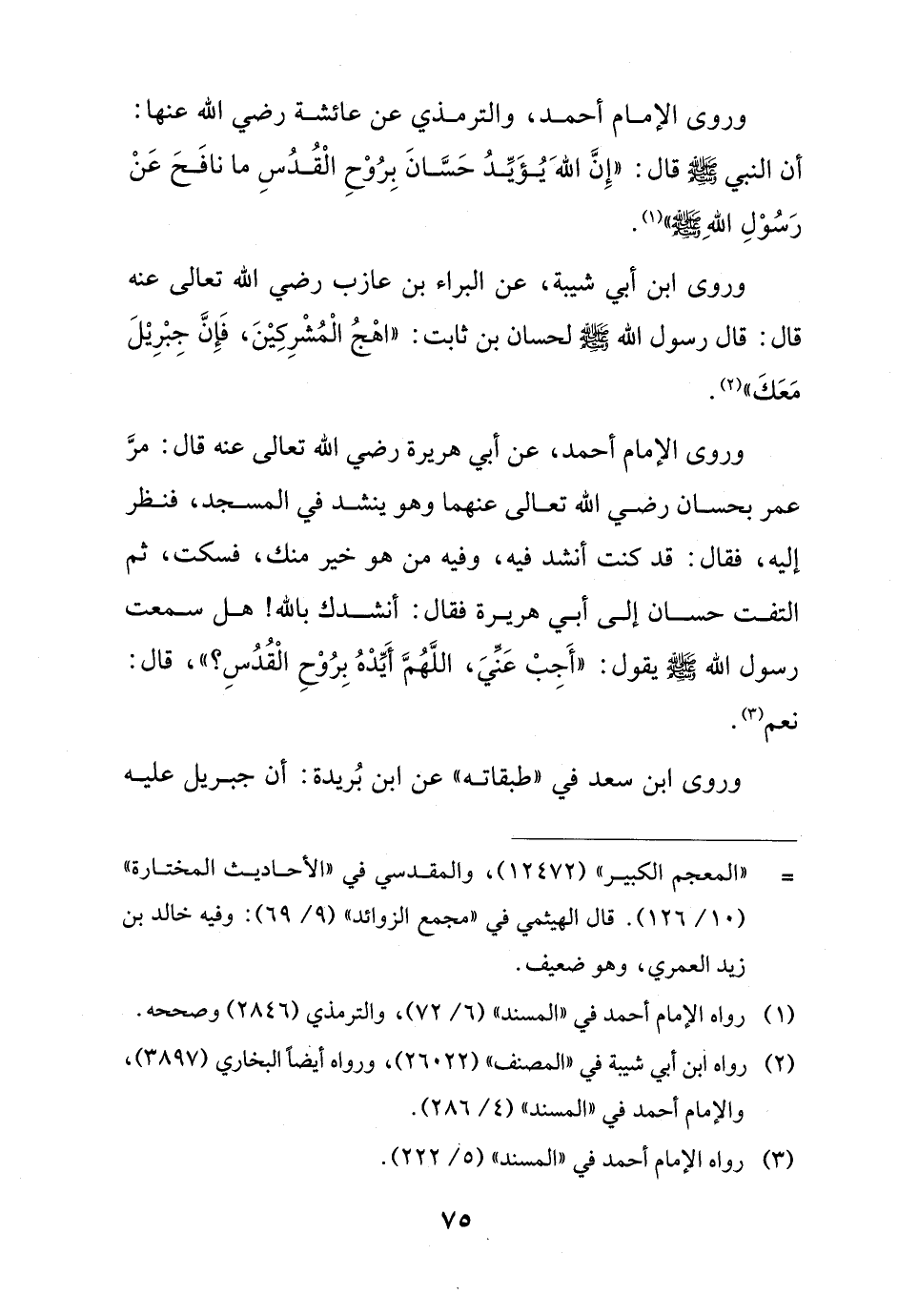 وروى الإمام أحمد، والترمذي عن عائشة رضي الله عنها: أن النبي - صلى الله عليه وسلم - قال: "إِنَّ اللهَ يُؤَيِّدُ حَسَّانَ بِرُوْحِ الْقُدُسِ ما نافَحَ عَنْ رَسُوْلِ اللهِ" (¬1).