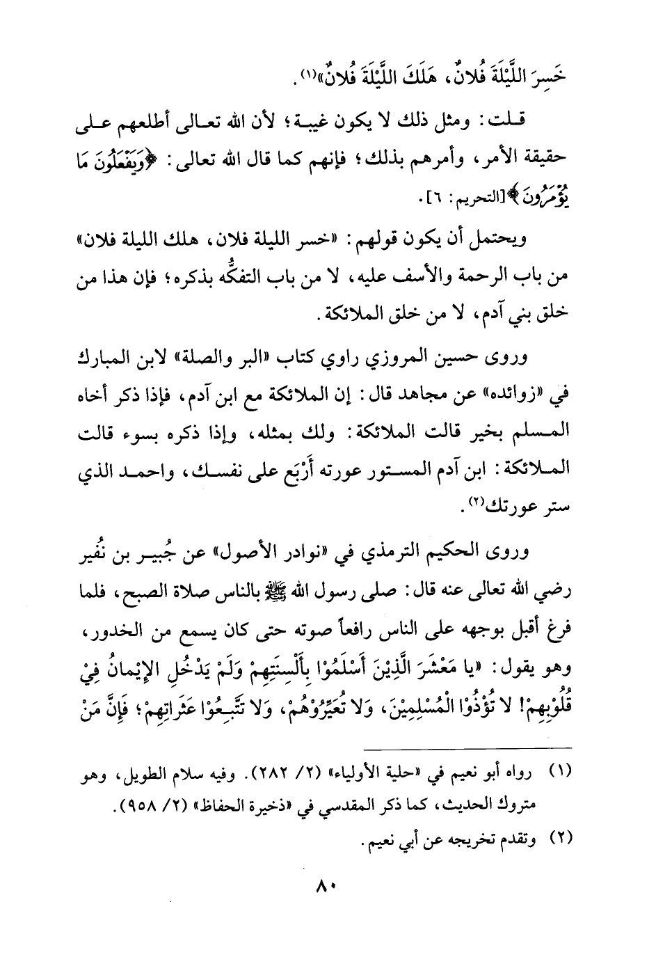 وروى الحكيم الترمذي في "نوادر الأصول" عن جُبير بن نُفير رضي الله تعالى عنه قال: صلى رسول الله - صلى الله عليه وسلم - بالناس صلاة الصبح، فلما فرغ أقبل بوجهه على الناس رافعاً صوته حتى كان يسمع من الخدور، وهو يقول: "يا مَعْشَرَ الَّذِيْنَ أَسْلَمُوْا بِأَلْسِنَتِهِمْ وَلَمْ يَدْخُلِ الإِيْمانُ فِيْ قُلُوْبهِمْ! لا تُؤْذُوْا الْمُسْلِمِيْنَ، وَلا تُعَيِّرُوْهُمْ، وَلا تتَّبِعُوْا عَثَراتِهِمْ؛ فَإِنَّ مَنْ