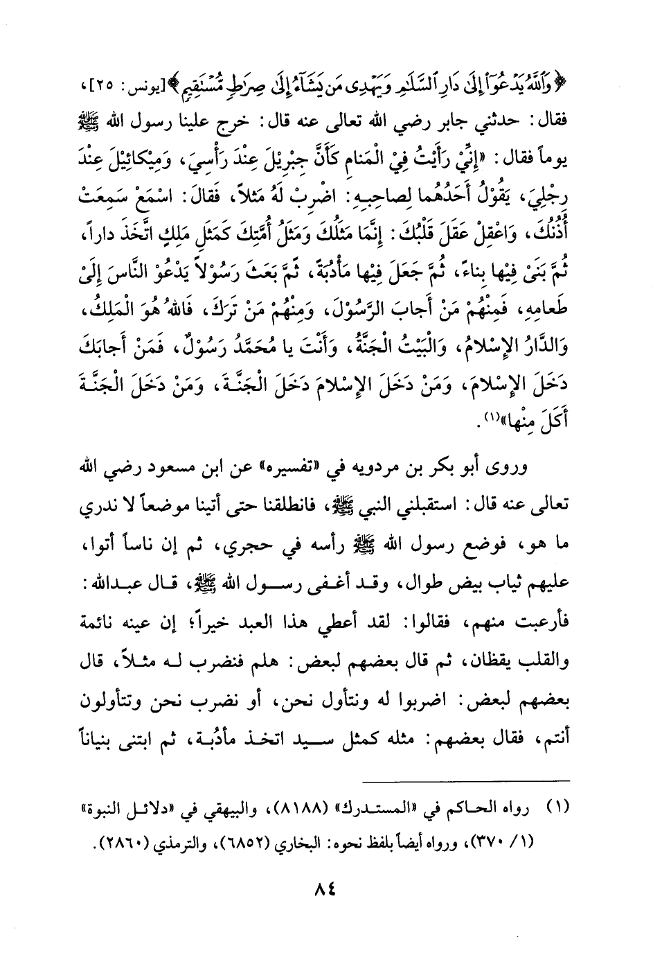 {وَاللَّهُ يَدْعُو إِلَى دَارِ السَّلَامِ وَيَهْدِي مَنْ يَشَاءُ إِلَى صِرَاطٍ مُسْتَقِيمٍ} [يونس: 25]، فقال: حدثني جابر رضي الله تعالى عنه قال: خرج علينا رسول الله - صلى الله عليه وسلم - يوماً فقال: "إِنِّيْ رَأَيْتُ فِيْ الْمَنامِ كَأَنَّ جِبْرِيْلَ عِنْدَ رَأْسِيَ، وَمِيْكائِيْلَ عِنْدَ رِجْلِيَ، يَقُوْلُ أحَدُهُما لِصاحِبِهِ: اضْرِبْ لَهُ مَثلاً، فَقالَ: اسْمَعْ سَمِعَتْ أُذُنُكَ، وَاعْقِلْ عَقَلَ قَلْبُكَ: إِنَّمَا مَثَلُكَ وَمَثَلُ أُمَّتِكَ كَمَثَلِ مَلِكٍ اتَّخَذَ داراً، ثُمَّ بَنَىْ فِيْها بِناءً، ثُمَّ جَعَلَ فِيْها مَأْدُبَةً، ثُمَّ بَعَثَ رَسُوْلاً يَدْعُوْ النَّاسَ إِلَىْ طَعامِهِ، فَمِنْهُمْ مَنْ أَجابَ الرَّسُوْلَ، وَمِنْهُمْ مَنْ تَرَكَ، فَاللهُ هُوَ الْمَلِكُ، وَالدَّارُ الإِسْلامُ، وَالْبَيْتُ الْجَنَّةُ، وَأَنْتَ يا مُحَمَّدُ رَسُوْلٌ، فَمَنْ أَجابَكَ دَخَلَ الأسْلامَ، وَمَنْ دَخَلَ الإِسْلامَ دَخَلَ الْجَنَّةَ، وَمَنْ دَخَلَ الْجَنَّةَ أَكَلَ مِنْها" (¬1).