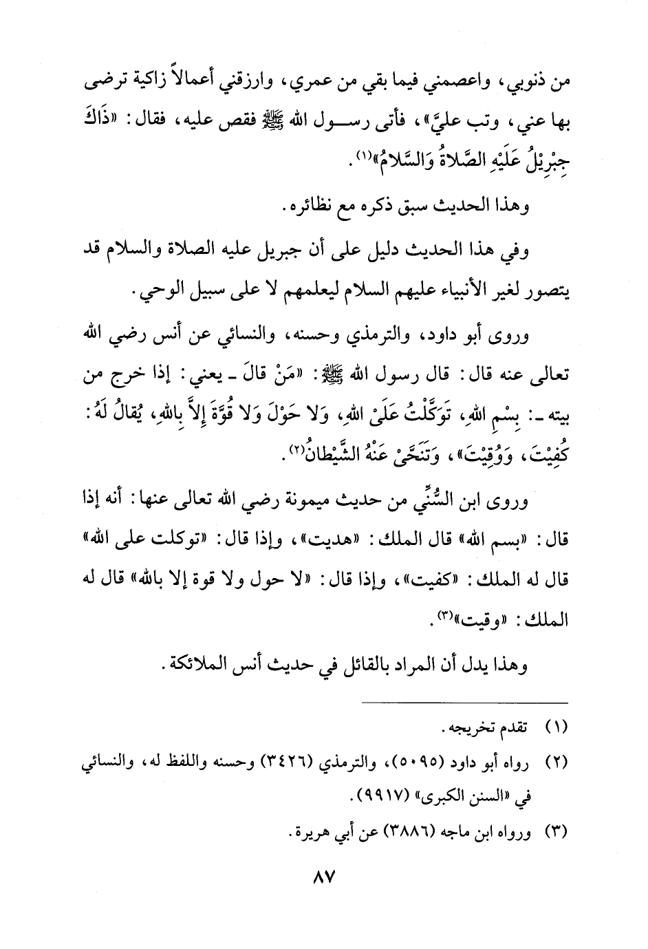 وروى أبو داود، والترمذي وحسنه، والنسائي عن أنس رضي الله تعالى عنه قال: قال رسول الله - صلى الله عليه وسلم -: "مَنْ قالَ - يعني: إذا خرج من بيته -: بِسْمِ اللهِ، تَوَكَّلْتُ عَلَىْ اللهِ، وَلا حَوْلَ وَلا قُوَّةَ إِلاَّ بِاللهِ، يُقالُ لَهُ: كُفِيْتَ، وَوُقِيْتَ"، وَتَنَحَّىْ عَنْهُ الشَّيْطانُ (¬2).