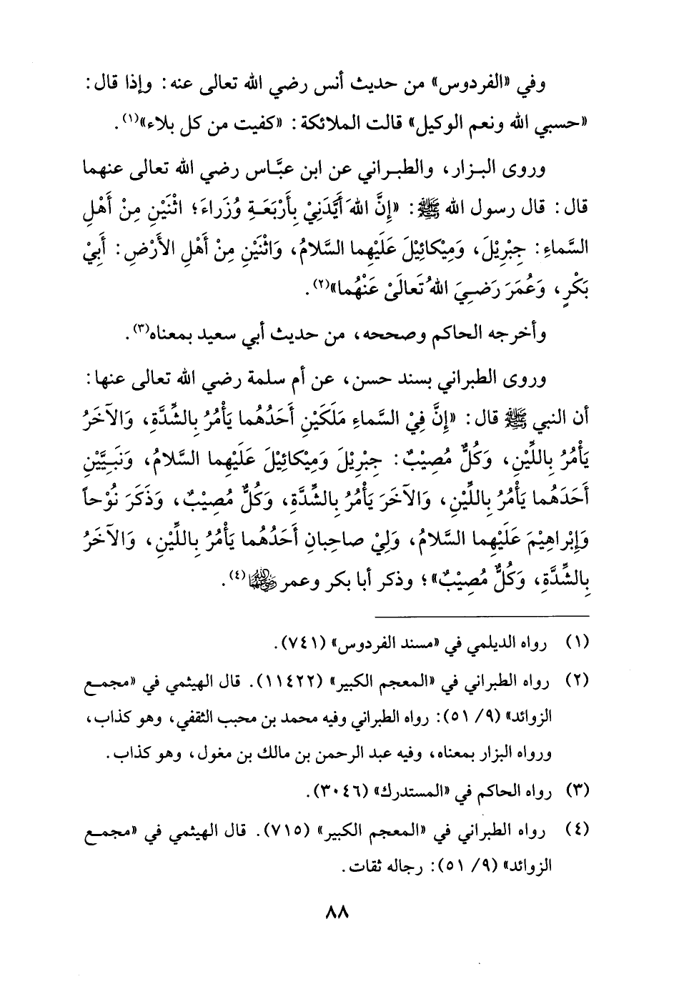 وروى الطبراني بسند حسن، عن أم سلمة رضي الله تعالى عنها: أن النبي - صلى الله عليه وسلم - قال: "إِنَّ فِيْ السَّماءِ مَلَكَيْنِ أَحَدُهُما يَأْمُرُ بِالشّدَّةِ، وَالآخَرُ يَأْمُرُ بِاللِّيْنِ، وَكُلٌّ مُصِيْبٌ: جِبْرِيْلَ وَمِيْكائِيْلَ عَلَيْهِما السَّلامُ، وَنبِيَّيْنِ أَحَدَهُما يَأمُرُ بِاللِّيْنِ، وَالآخَرَ يَأْمُرُ بِالشِّدَّةِ، وَكُلٌّ مُصِيْبٌ، وَذَكَرَ نُوْحاً وَإِبْراهِيْمَ عَلَيْهِما السَّلامُ، وَلِيْ صاحِبانِ أَحَدُهُما يَأْمُرُ بِاللِّيْنِ، وَالآخَرُ بِالشِّدَّةِ، وَكُلٌّ مُصِيْبٌ"؛ وذكر أبا بكر وعمر - رضي الله عنهما - (¬4).