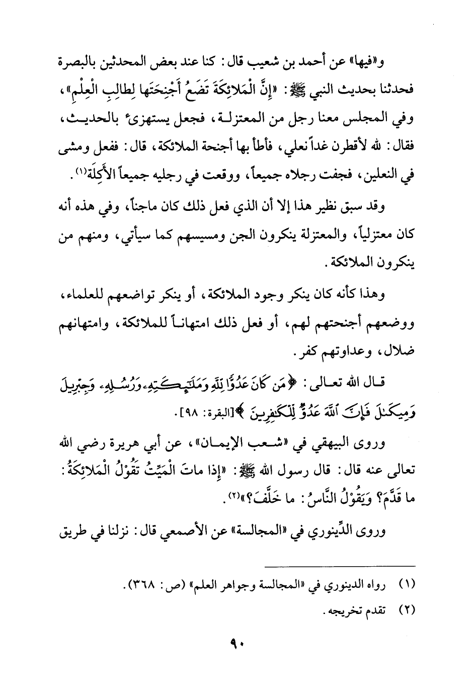 و"فيها" عن أحمد بن شعيب قال: كنا عند بعض المحدثين بالبصرة فحدثنا بحديث النبي - صلى الله عليه وسلم -: "إِنَّ الْمَلائِكَةَ تَضَعُ أَجْنِحَتَها لِطالِبِ الْعِلْمِ"، وفي المجلس معنا رجل من المعتزلة، فجعل يستهزئ بالحديث، فقال: لله لأقطرن غداً نعلي، فأطأ بها أجنحة الملائكة، قال: ففعل ومشى في النعلين، فجفت رجلاه جميعاً، ووقعت في رجليه جميعاً الأكِلَة (¬1).