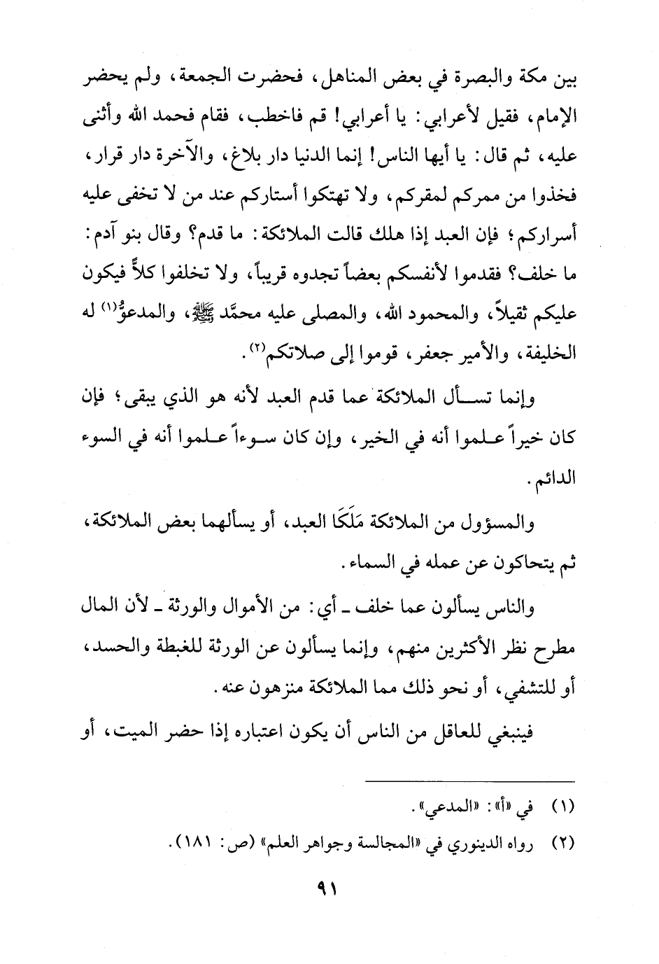 بين مكة والبصرة في بعض المناهل، فحضرت الجمعة، ولم يحضر الإمام، فقيل لأعرابي: يا أعرابي! قم فاخطب، فقام فحمد الله وأثنى عليه، ثم قال: يا أيها الناس! إنما الدنيا دار بلاع، والآخرة دار قرار، فخذوا من ممركم لمقركم، ولا تهتكوا أستاركم عند من لا تخفى عليه أسراركم؛ فإن العبد إذا هلك قالت الملائكة: ما قدم؟ وقال بنو آدم: ما خلف؟ فقدموا لأنفسكم بعضاً تجدوه قريباً، ولا تخلفوا كلًّا فيكون عليكم ثقيلاً، والمحمود الله، والمصلى عليه محمَّد - صلى الله عليه وسلم -، والمدعوُّ (¬1) له الخليفة، والأمير جعفر، قوموا إلى صلاتكم (¬2).