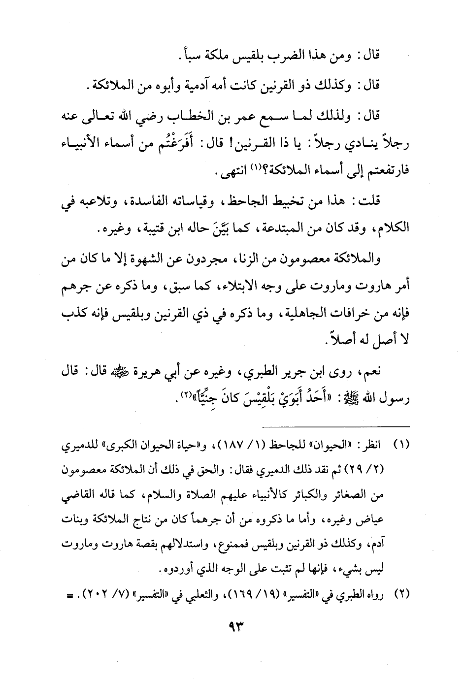 (¬1) انظر: "الحيوان" للجاحظ (1/ 187)، و"حياة الحيوان الكبرى" للدميري (2/ 29) ثم نقد ذلك الدميري فقال: والحق في ذلك أن الملائكة معصومون من الصغائر والكبائر كالأنبياء عليهم الصلاة والسلام، كما قاله القاضي عياض وغيره، وأما ما ذكروه من أن جرهماً كان من نتاج الملائكة وبنات آدم، وكذلك ذو القرنين وبلقيس فممنوع، واستدلالهم بقصة هاروت وماروت ليس بشيء، فإنها لم تثبت على الوجه الذي أوردوه.