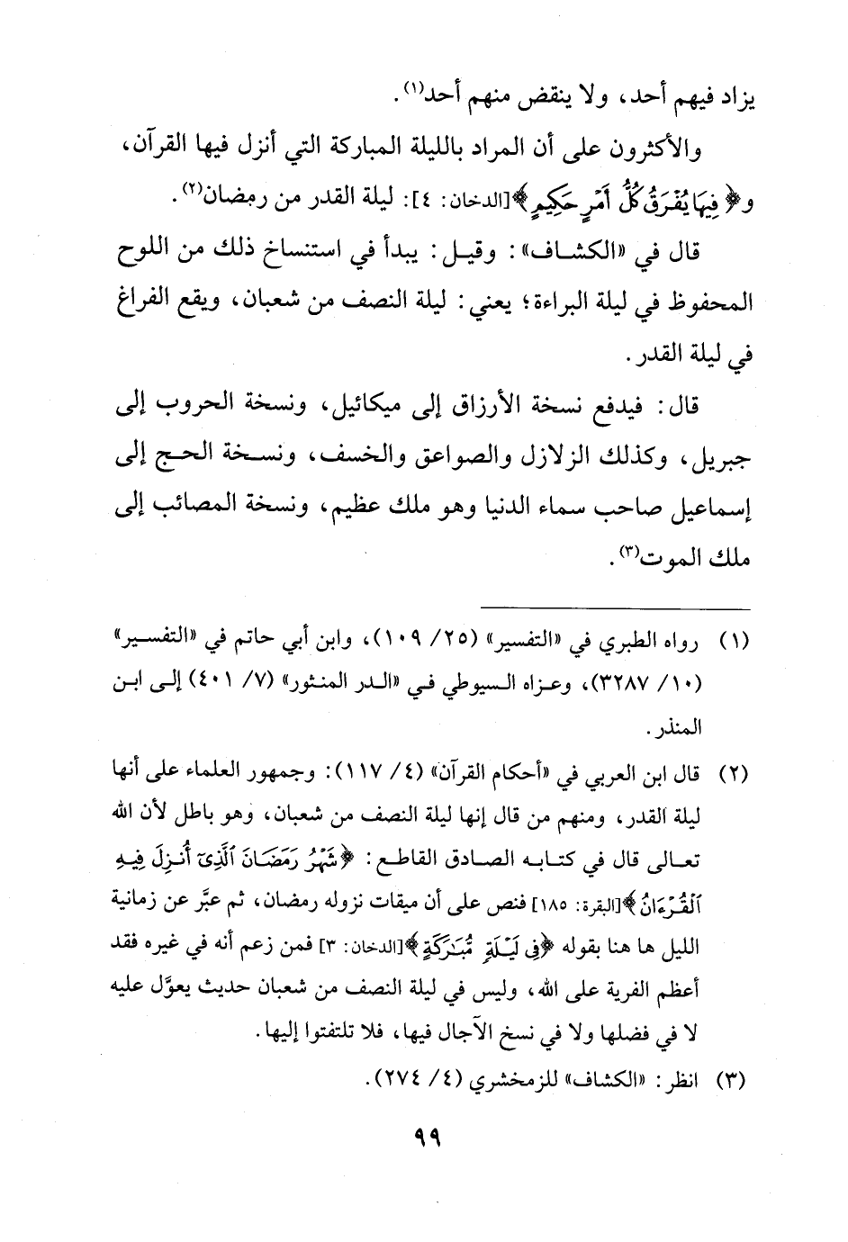 (¬2) قال ابن العربي في "أحكام القرآن" (4/ 117): وجمهور العلماء على أنها ليلة القدر، ومنهم من قال إنها ليلة النصف من شعبان، وهو باطل لأن الله تعالى قال في كتابه الصادق القاطع: {شَهْرُ رَمَضَانَ الَّذِي أُنْزِلَ فِيهِ الْقُرْآنُ} [البقرة: 185] فنص على أن ميقات نزوله رمضان، ثم عبَّر عن زمانية الليل ها هنا بقوله {إِنَّا أَنْزَلْنَاهُ فِي لَيْلَةٍ مُبَارَكَةٍ} [الدخان: 3] فمن زعم أنه في غيره فقد أعظم الفرية على الله، وليس في ليلة النصف من شعبان حديث يعوَّل عليه لا في فضلها ولا في نسخ الآجال فيها، فلا تلتفتوا إليها.