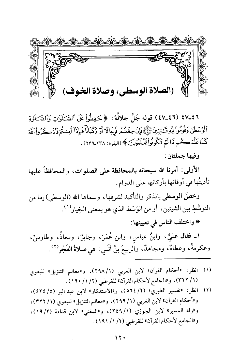 47 - 46 (47 - 46) قوله جَلَّ جلالُهُ: {حَافِظُوا عَلَى الصَّلَوَاتِ وَالصَّلَاةِ الْوُسْطَى وَقُومُوا لِلَّهِ قَانِتِينَ (238) فَإِنْ خِفْتُمْ فَرِجَالًا أَوْ رُكْبَانًا فَإِذَا أَمِنْتُمْ فَاذْكُرُوا اللَّهَ كَمَا عَلَّمَكُمْ مَا لَمْ تَكُونُوا تَعْلَمُونَ} [البقرة: 238، 239].