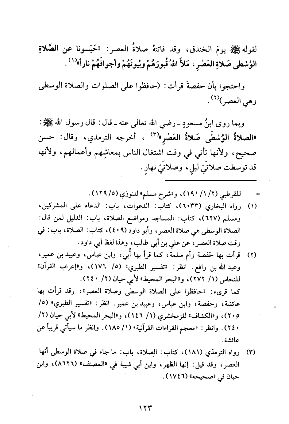 وبما روى ابنُ مسعودٍ -رضي الله تعالى عنه- قال: قال رسول الله - صلى الله عليه وسلم -: "الصلاةُ الوُسْطَى صَلاةُ العَصرِ" (¬3)، أخرجه الترمذي، وقال: حسن صحيح، ولأنها تأتي في وقت اشتغال الناس بمعاشِهم وأعمالهم، ولأنها قد توسطت صلاتي ليلٍ، وصلاتَيْ نهارٍ.