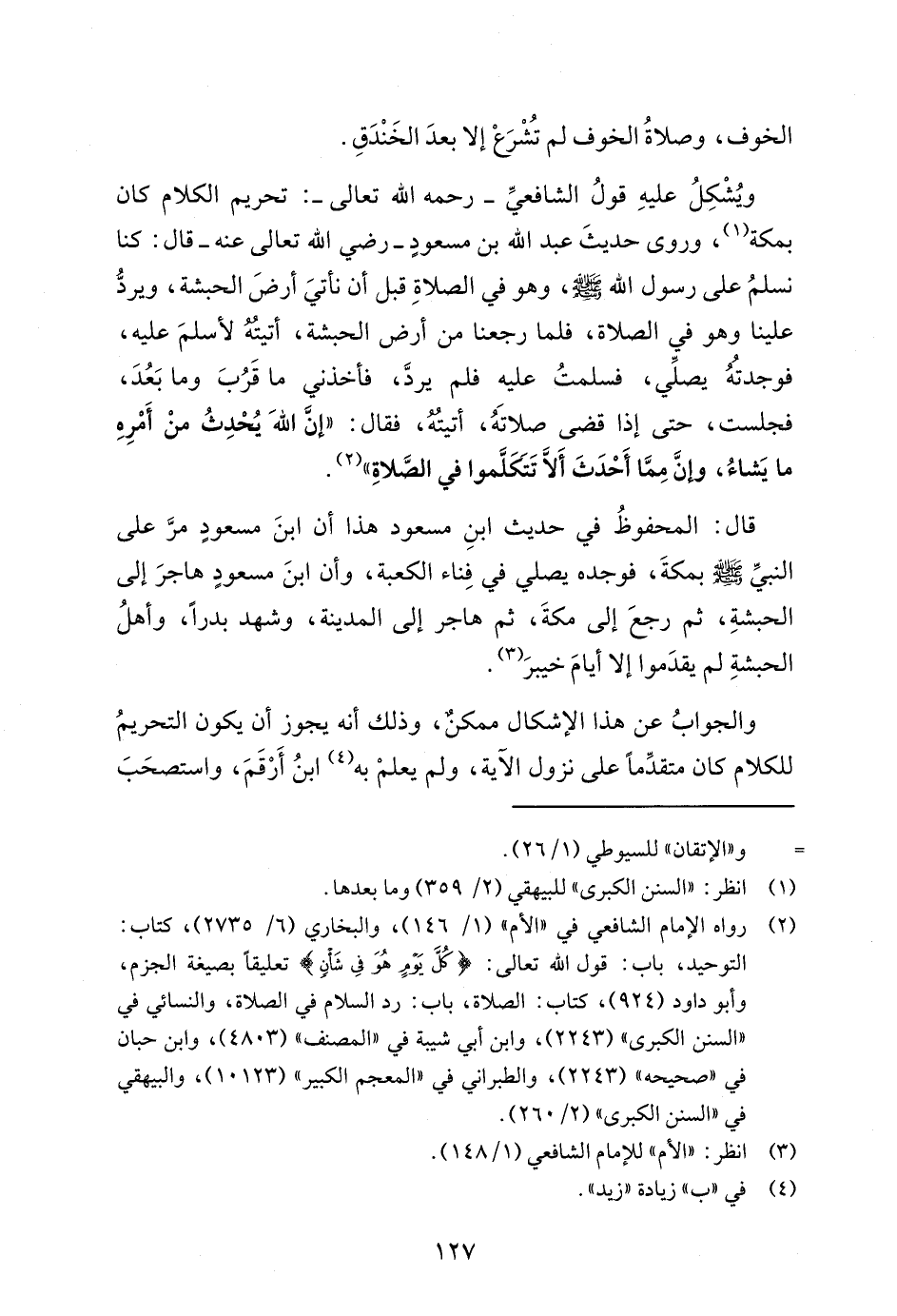 ويُشْكِلُ عليهِ قولُ الشافعيِّ -رحمه الله تعالى-: تحريم الكلام كان بمكة (¬1)، وروى حديثَ عبد الله بن مسعودٍ -رضي الله تعالى عنه- قال: كنا نسلمُ على رسول الله - صلى الله عليه وسلم -، وهو في الصلاةِ قبل أن نأتيَ أرضَ الحبشة، ويردُّ علينا وهو في الصلاة، فلما رجعنا من أرض الحبشة، أتيته لأسلمَ عليه، فوجدتُهُ يصلِّي، فسلمتُ عليه فلم يردَّ، فأخذني ما قَرُبَ وما بَعُدَ، فجلست، حتى إذا قضى صلاتَهُ، أتيتُهُ، فقال: "إن الله يُحْدِثُ منْ أمْرِهِ ما يَشاءُ، وإنَّ مِمَّا أحدَثَ أَلأَ تَتَكَلَّموا في الصَّلاةِ" (¬2).