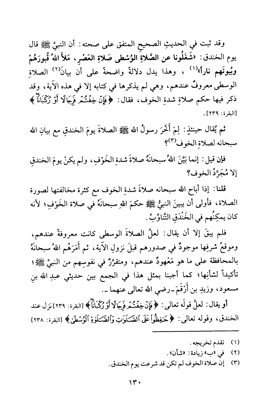 وقد ثبت في الحديثِ الصحيحِ المتفق على صحته: أن النبيَّ - صلى الله عليه وسلم - قال يوم الخندق: "شَغَلُونا عن الصَّلاةِ الوُسْطى صَلاةِ العَصرِ، مَلأَ اللهُ قُبورَهُمْ وبُيوتَهم ناراً" (¬1)، وهذا يدل دلالةً واضحةً على أن بيانَ (¬2) الصلاةِ الوسطى معروفٌ عندهم، وهي لم يذكرها في كتابه إلا في هذه الآية، وقد ذكر فيها حكم صلاةِ شدةِ الخوف، فقال: {فَإِنْ خِفْتُمْ فَرِجَالًا أَوْ رُكْبَانًا} [البقرة: 239].