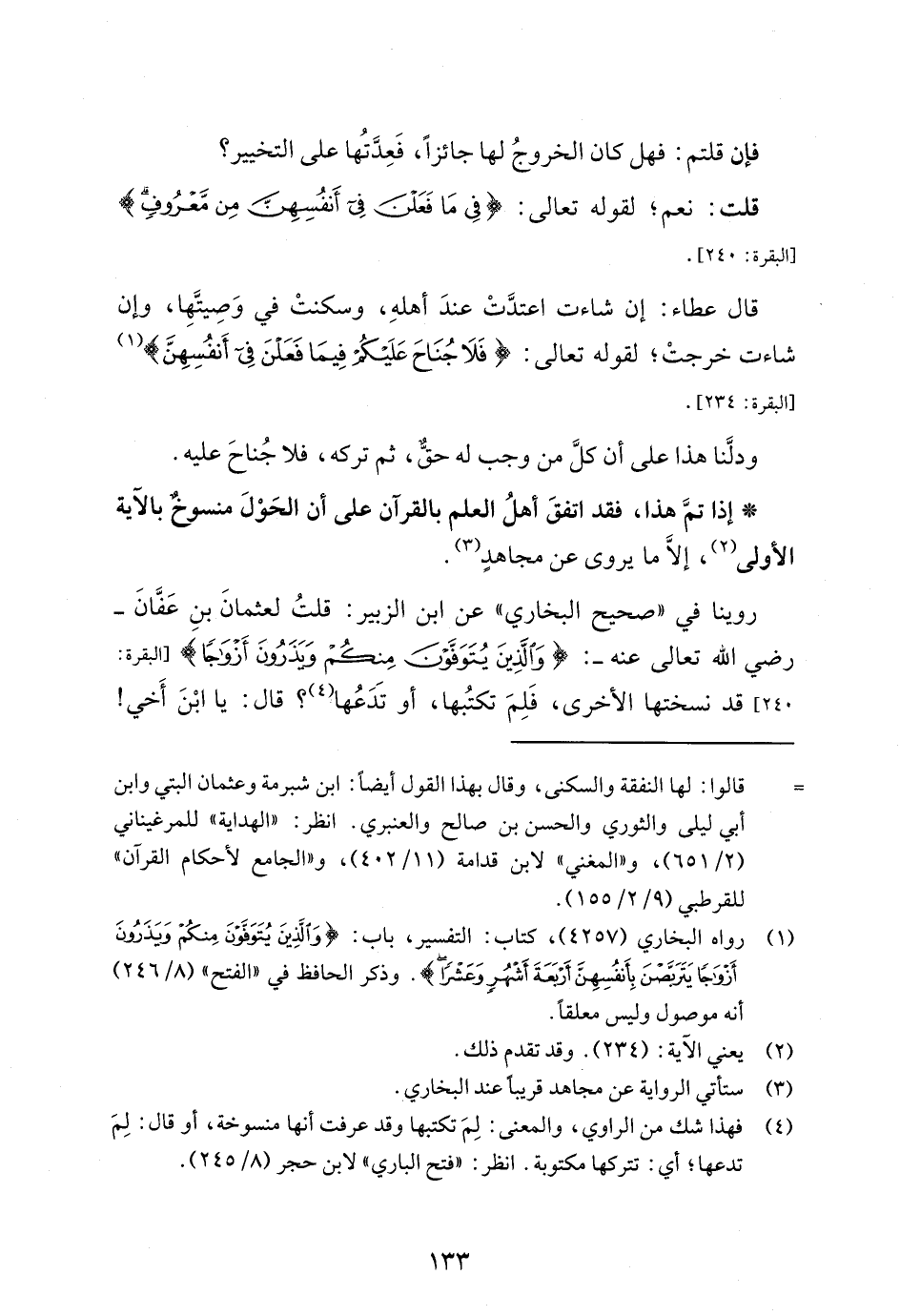 * إذا تمَّ هذا، فقد اتفقَ أهلُ العلم بالقرآن على أن الحَوْلَ منسوخٌ بالآية الأولى (¬2)، إلَّا ما يروى عن مجاهدٍ (¬3).