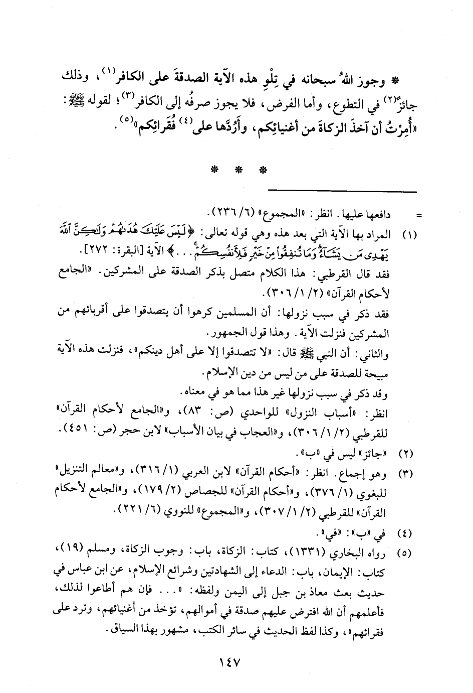 * وجوز اللهُ سبحانه في تِلْوِ هذه الآية الصدقةَ على الكافر (¬1)، وذلك جائزٌ (¬2) في التطوع، وأما الفرض، فلا يجوز صرفُه إلى الكافر (¬3)؛ لقوله - صلى الله عليه وسلم -: "أُمِرْتُ أن آخذَ الزكاةَ من أغنيائِكم، وأَرُدَّها على (¬4) فُقَرائِكم" (¬5).