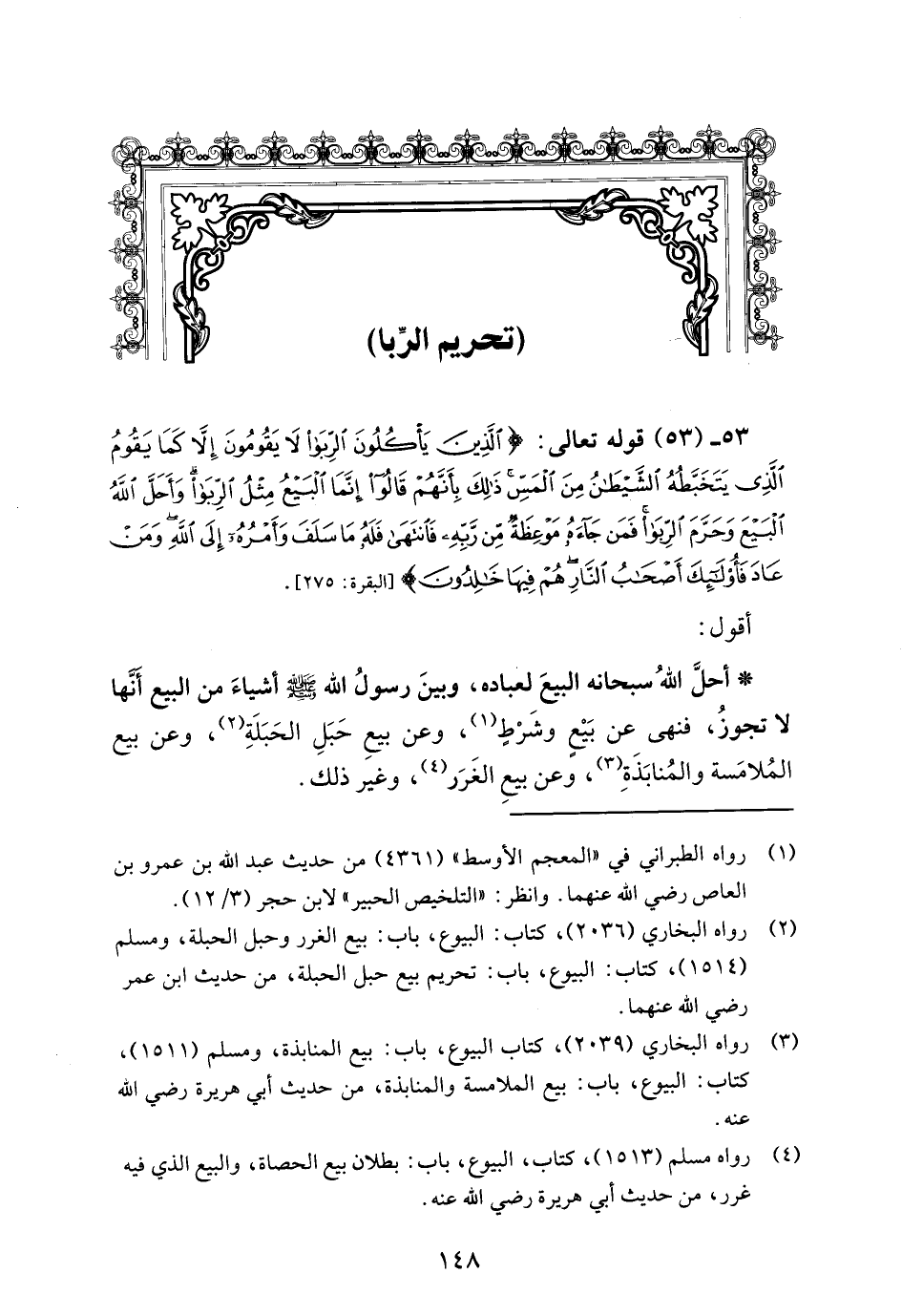 53 - (53) قوله تعالى: {الَّذِينَ يَأْكُلُونَ الرِّبَا لَا يَقُومُونَ إِلَّا كَمَا يَقُومُ الَّذِي يَتَخَبَّطُهُ الشَّيْطَانُ مِنَ الْمَسِّ ذَلِكَ بِأَنَّهُمْ قَالُوا إِنَّمَا الْبَيْعُ مِثْلُ الرِّبَا وَأَحَلَّ اللَّهُ الْبَيْعَ وَحَرَّمَ الرِّبَا فَمَنْ جَاءَهُ مَوْعِظَةٌ مِنْ رَبِّهِ فَانْتَهَى فَلَهُ مَا سَلَفَ وَأَمْرُهُ إِلَى اللَّهِ وَمَنْ عَادَ فَأُولَئِكَ أَصْحَابُ النَّارِ هُمْ فِيهَا خَالِدُونَ} [البقرة: 275].
