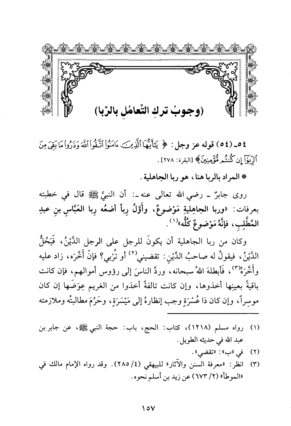 54 - (54) قوله عز وجل: {يَاأَيُّهَا الَّذِينَ آمَنُوا اتَّقُوا اللَّهَ وَذَرُوا مَا بَقِيَ مِنَ الرِّبَا إِنْ كُنْتُمْ مُؤْمِنِينَ} [البقرة: 278].