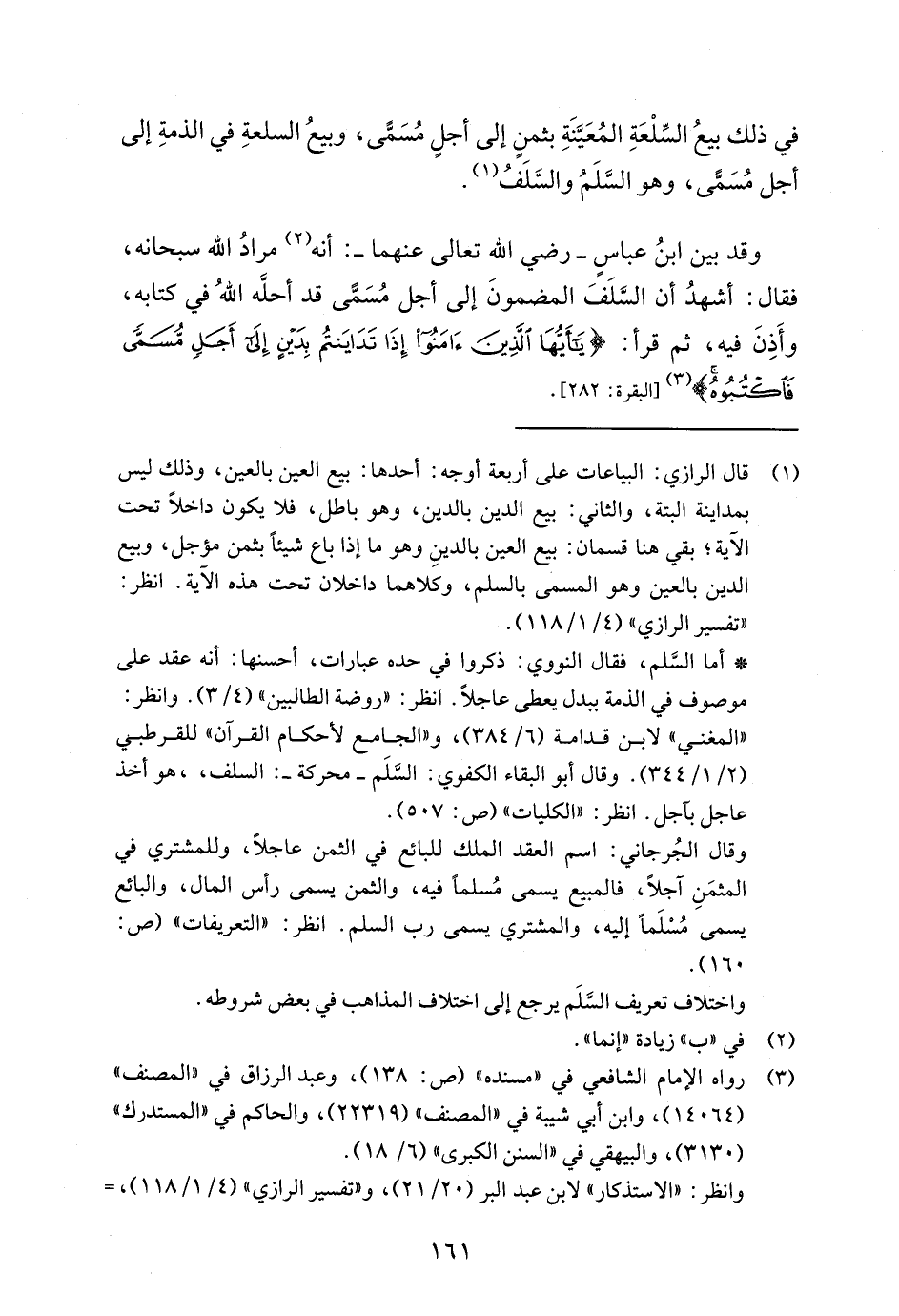 وقد بين ابنُ عباسٍ -رضي الله تعالى عنهما-: أنه (¬2) مرادُ الله سبحانه، فقال: أشهدُ أن السَّلَفَ المضمونَ إلى أجل مُسَمًّى قد أحلَّه اللهُ في كتابه، وأَذِنَ فيه، ثم قرأ: {يَاأَيُّهَا الَّذِينَ آمَنُوا إِذَا تَدَايَنْتُمْ بِدَيْنٍ إِلَى أَجَلٍ مُسَمًّى فَاكْتُبُوهُ} (¬3) [البقرة: 282].