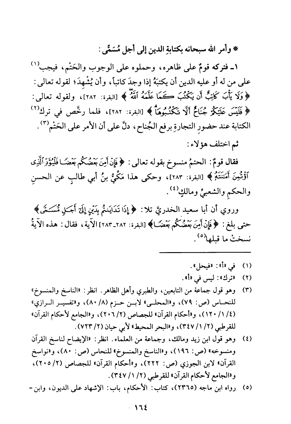 فقال قومٌ: الحتمُ منسوخ بقوله تعالى: {فَإِنْ أَمِنَ بَعْضُكُمْ بَعْضًا فَلْيُؤَدِّ الَّذِي اؤْتُمِنَ أَمَانَتَهُ} [البقرة: 283]، وحكى هذا مَكِّيُّ بنُ أبي طالبٍ عن الحسنِ والحكمِ والشعبيّ ومالك (¬4).