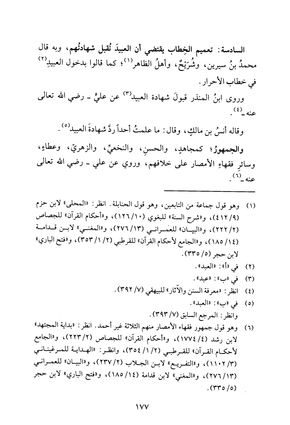 السادسة: تعميم الخِطاب يقتضي أن العبيدَ تُقبل شهادتُهم، وبه قال محمدُ بنُ سيرين، وشُرَيْحٌ، وأهلُ الظاهر (¬1)؛ كما قالوا بدخول العبيدِ (¬2) في خطاب الأحرار.