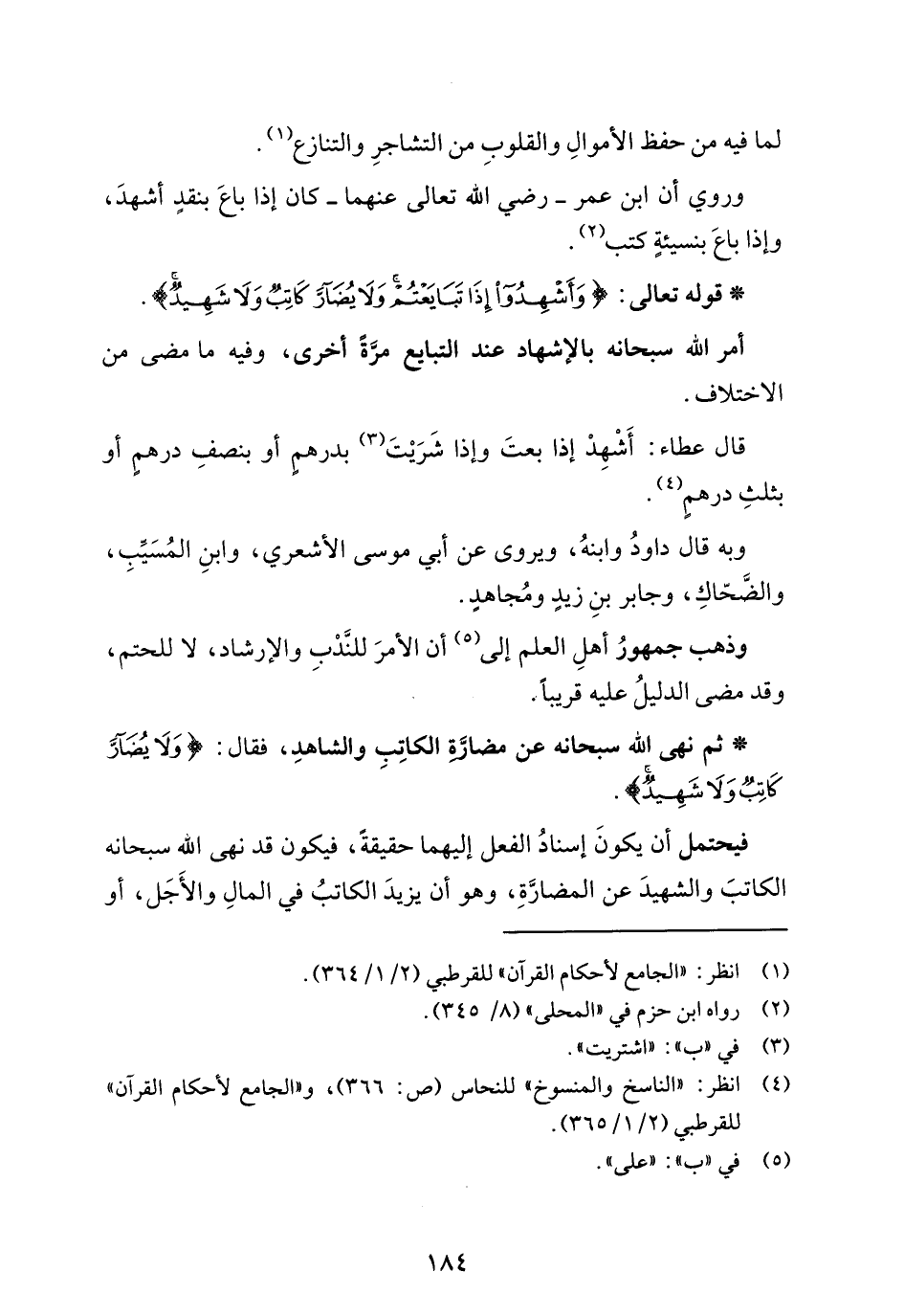 * قوله تعالى: {وَأَشْهِدُوا إِذَا تَبَايَعْتُمْ وَلَا يُضَارَّ كَاتِبٌ وَلَا شَهِيدٌ}.
