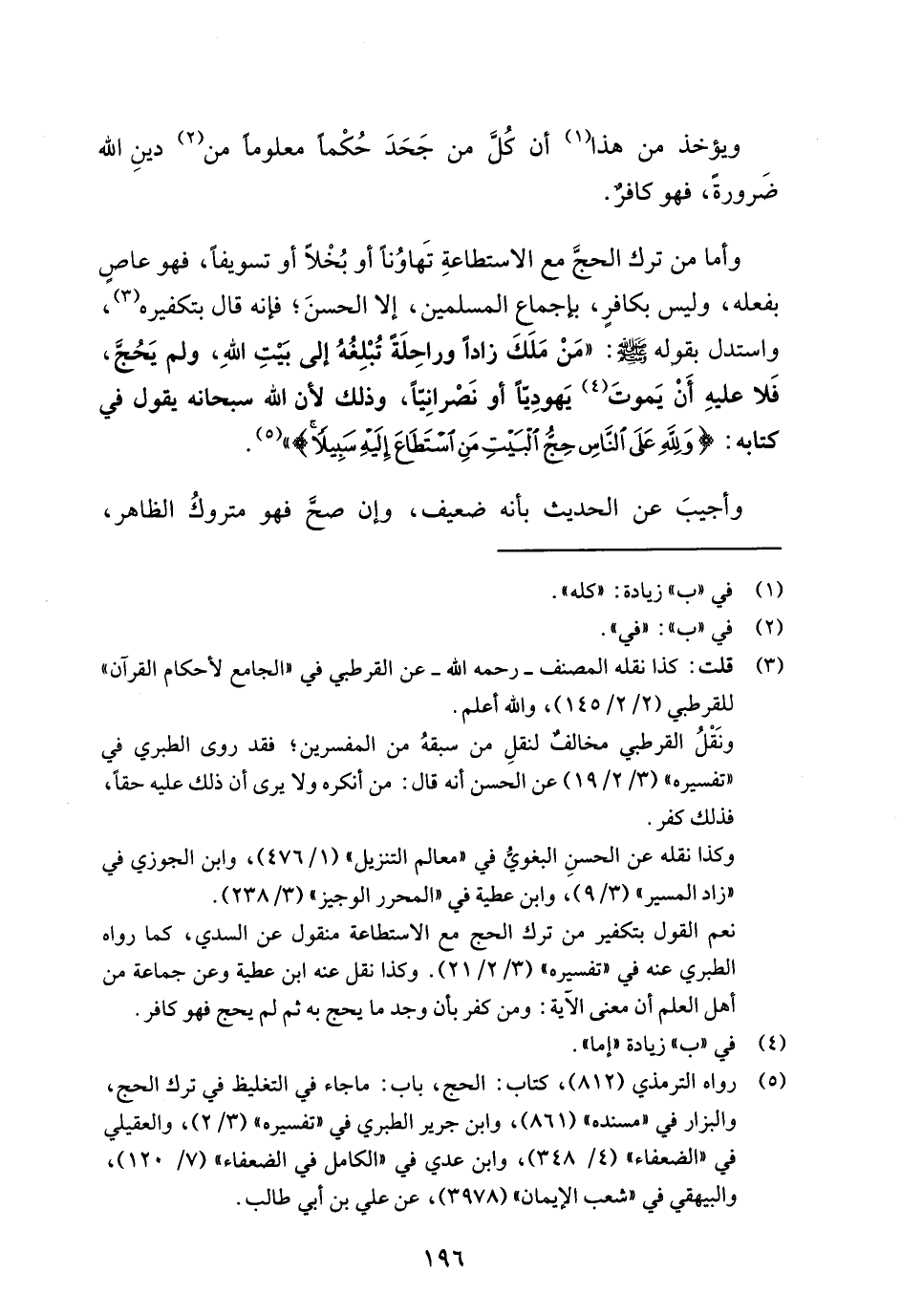 نعم القول بتكفير من ترك الحج مع الاستطاعة منقول عن السدي، كما رواه الطبري عنه في "تفسيره" (3/ 2/ 21). وكذا نقل عنه ابن عطية وعن جماعة من أهل العلم أن معنى الآية: ومن كفر بأن وجد ما يحج به ثم لم يحج فهو كافر.