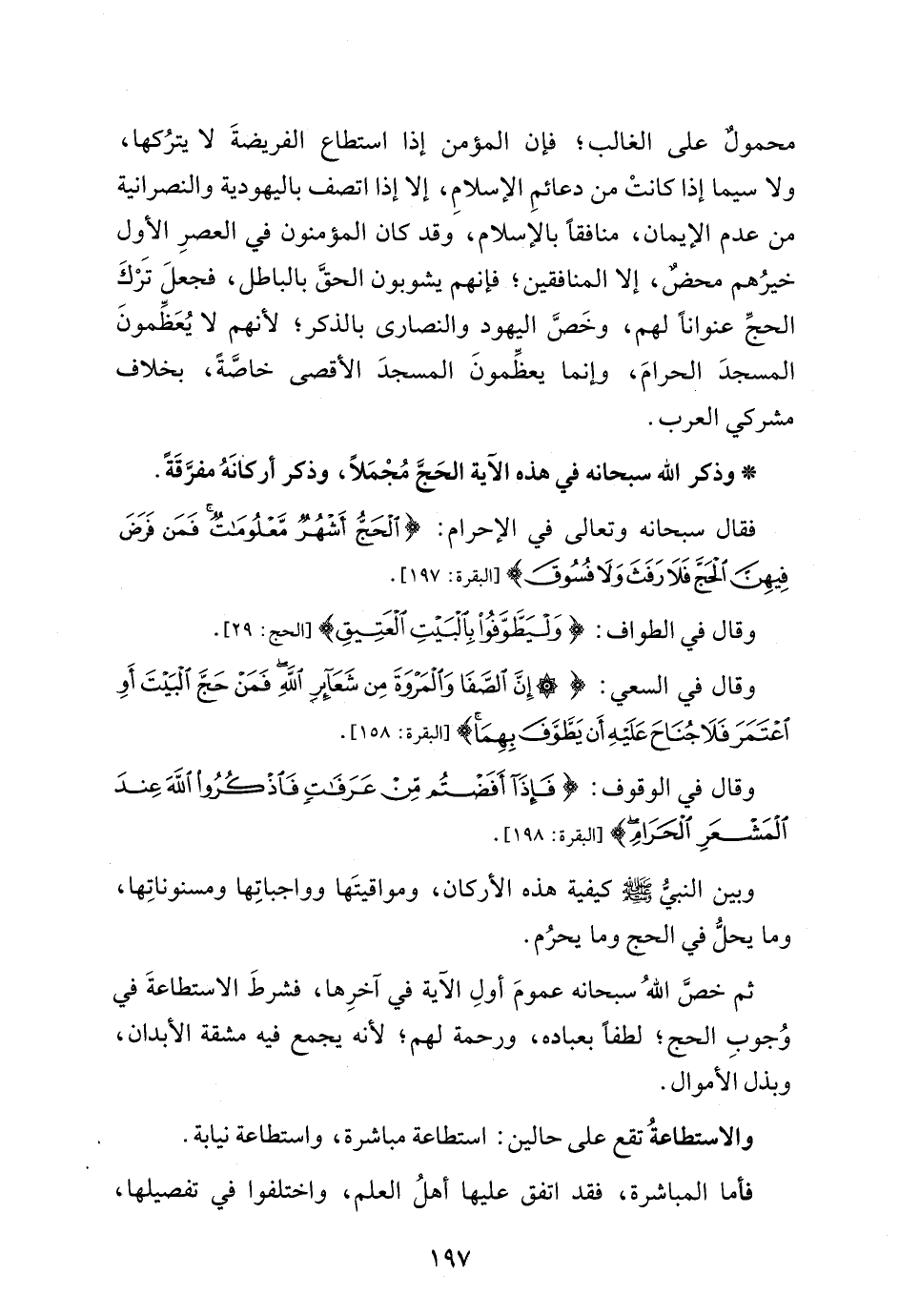ثم خصَّ اللهُ سبحانه عمومَ أولِ الآية في آخرِها، فشرطَ الاستطاعةَ في وُجوبِ الحج؛ لطفًا بعباده، ورحمة لهم؛ لأنه يجمع فيه مشقة الأبدان، وبذل الأموال.