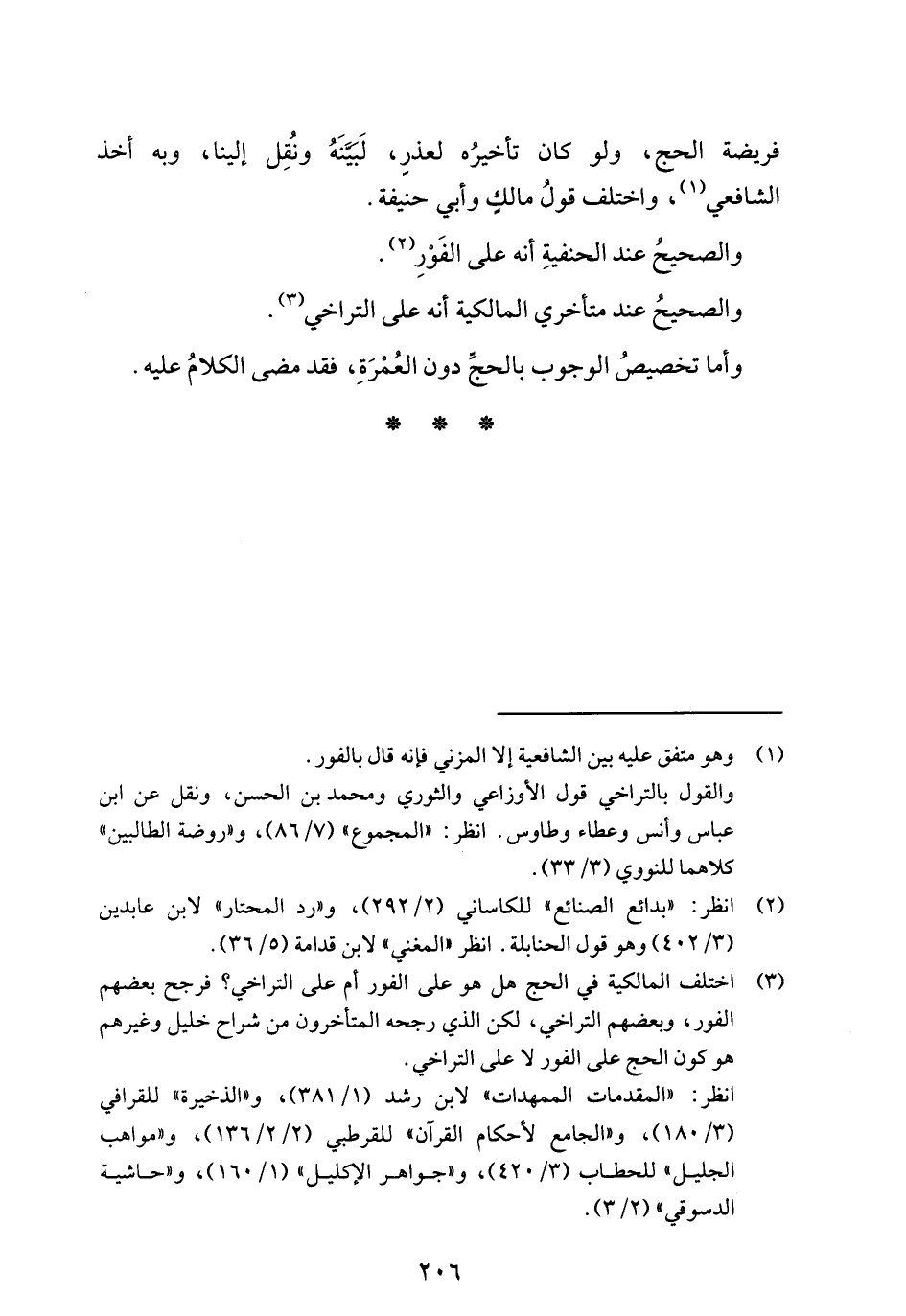 (¬3) اختلف المالكية في الحج هل هو على الفور أم على التراخي؟ فرجح بعضهم الفور، وبعضهم التراخي، لكن الذي رجحه المتأخرون من شراح خليل وغيرهم هو كون الحج على الفور لا على التراخي.