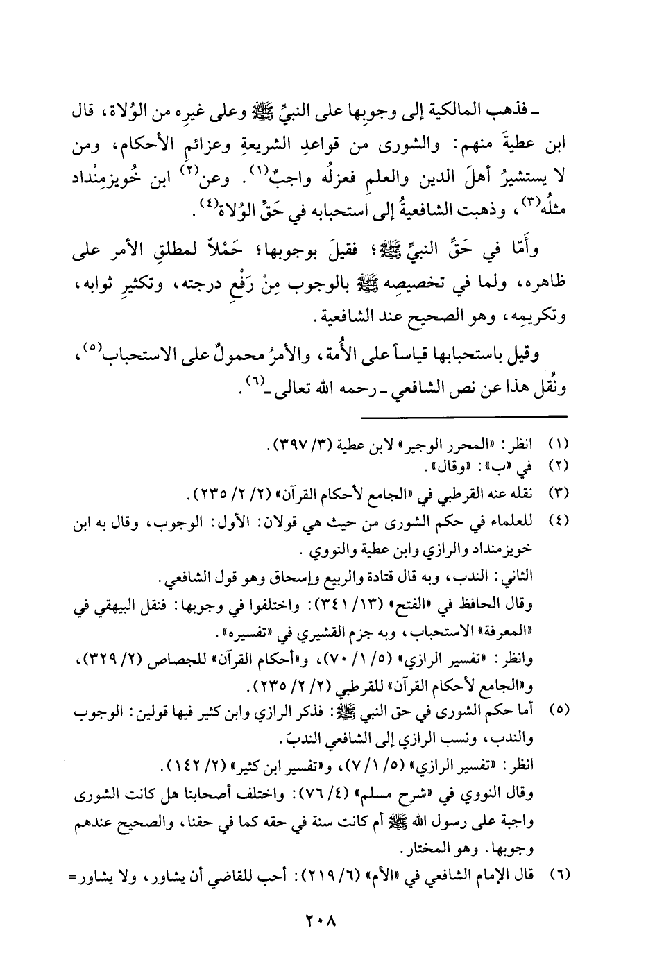 (¬4) للعلماء في حكم الشورى من حيث هي قولان: الأول: الوجوب، وقال به ابن خويز منداد والرازي وابن عطية والنووي.
