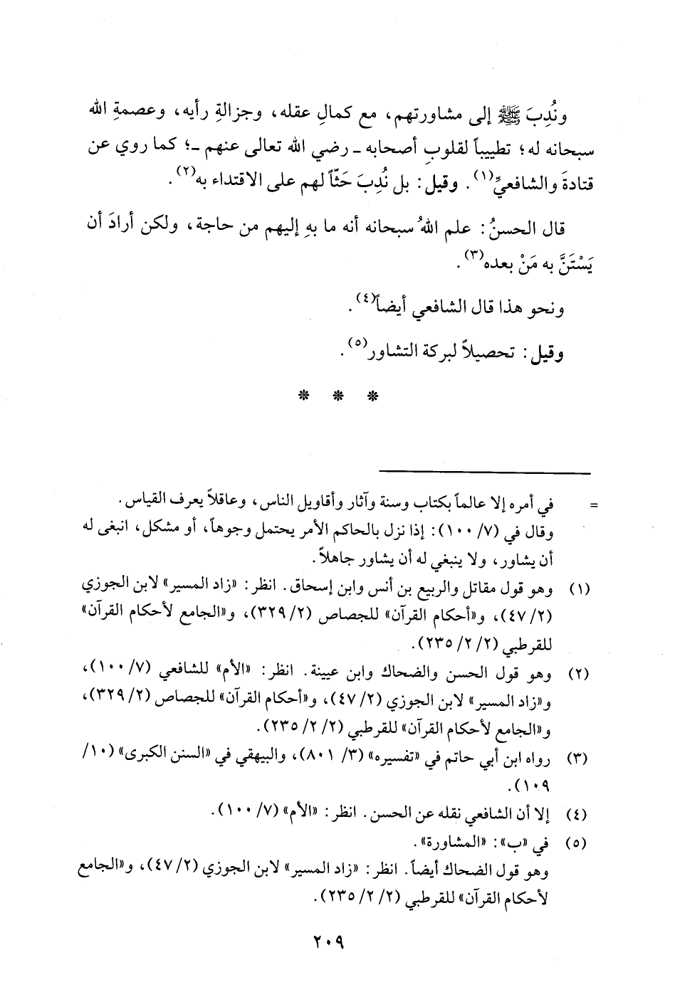 ونُدِبَ - صلى الله عليه وسلم - إلى مشاورتهم، مع كمالِ عقله، وجزالةِ رأيه، وعصمةِ الله سبحانه له؛ تطييبًا لقلوبِ أصحابه -رضي الله تعالى عنهم-؛ كما روي عن قتادةَ والشافعيِّ (¬1). وقيل: بل نُدِبَ حَثًّا لهم على الاقتداء به (¬2).