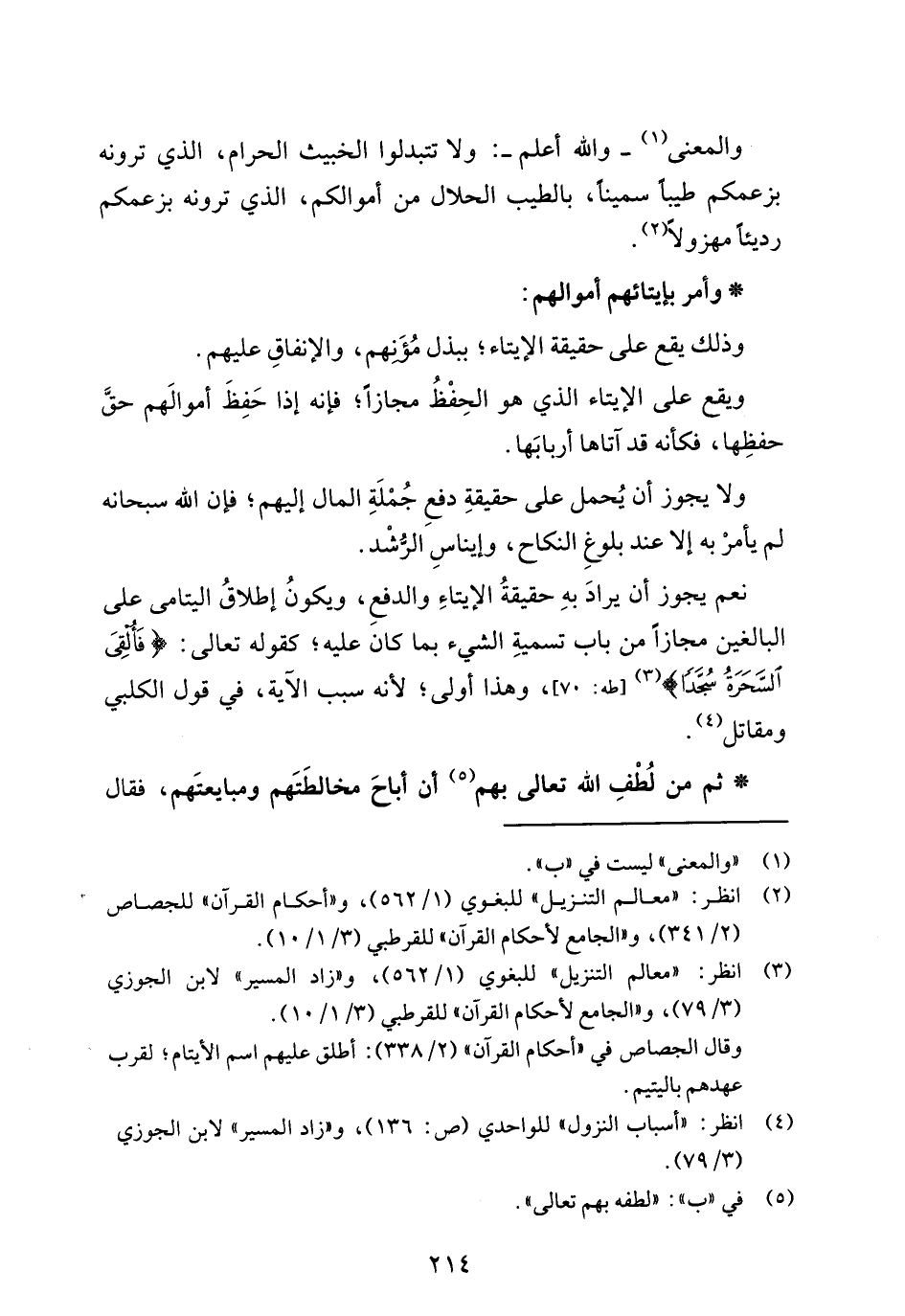 ولا يجوز أن يُحمل على حقيقةِ دفعِ جُمْلَةِ المال إليهم؛ فإن الله سبحانه لم يأمرْ به إلا عند بلوغِ النكاح، وإيناسِ الرُّشْد.