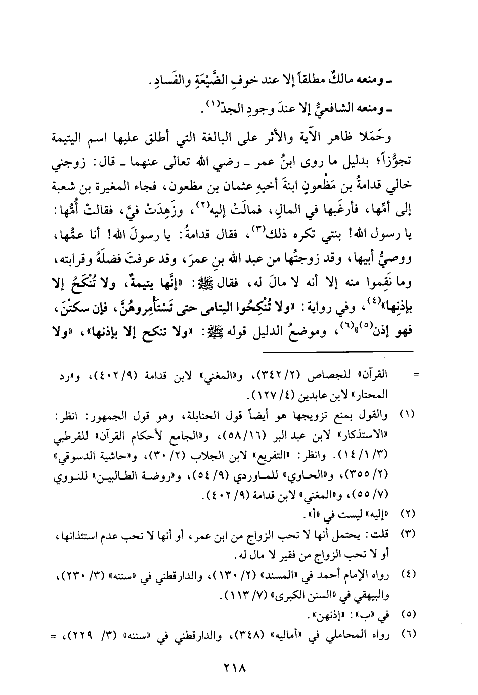 وحَمَلا ظاهر الآية والأثر على البالغة التي أطلق عليها اسم اليتيمة تجوُّزًا؛ بدليل ما روى ابنُ عمر -رضي الله تعالى عنهما- قال: زوجني خالي قدامةُ بن مَظْعونٍ ابنةَ أخيهِ عثمان بن مظعون، فجاء المغيرة بن شعبة إلى أمِّها، فأرغَبها في المالِ، فمالَتْ إليه (¬2)، وزَهِدَتْ فيَّ، فقالتْ أُمُّها: يا رسول الله! بنتي تكره ذلك (¬3)، فقال قدامةُ: يا رسولَ الله! أنا عمُّها، ووصيُّ أبيها، وقد زوجتُها من عبد الله بنِ عمرَ، وقد عرفتَ فضلَهُ وقرابته، وما نَقِموا منه إلا أنه لا مالَ له، فقال - صلى الله عليه وسلم -: "إنَّها يتيمةٌ، ولا تُنْكَحُ إلا بإذنِها" (¬4)، وفي رواية: "ولا تُنْكِحُوا اليتامى حتى تَسْتأْمِروهُنَّ، فإن سكتْنَ، فهو إذن (¬5) " (¬6)، وموضعُ الدليل قوله - صلى الله عليه وسلم -: "ولا تنكح إلا بإذنها"، "ولا