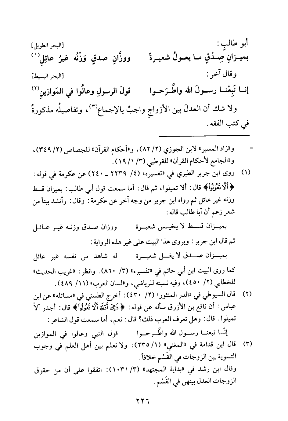 (¬1) روى ابن جرير الطبري في "تفسيره" (4/ 2239 - 240) عن عكرمة في قوله: {أَلَّا تَعُولُوا} قال: ألا تميلوا، ثم قال: أما سمعت قول أبي طالب: بميزان قسط وزنه غير عائل ثم رواه ابن جرير من وجه آخر عن عكرمة: وقال: وأنشد بيتًا من شعر زعم أن أبا طالب قاله: