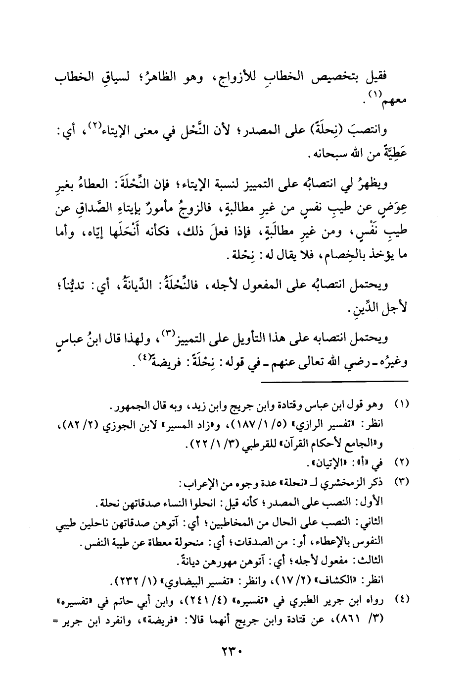 ويحتمل انتصابه على هذا التأويل على التمييز (¬3)، ولهذا قال ابنُ عباس وغيرُه -رضي الله تعالى عنهم- في قوله: نِحْلَةً: فريضةً (¬4).
