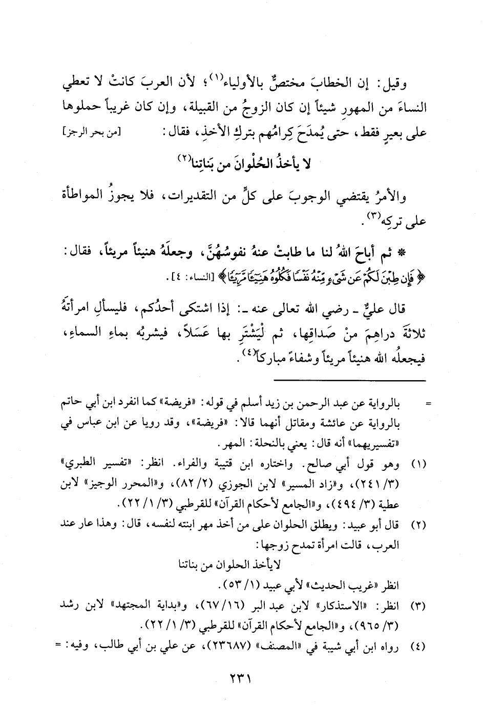 * ثم أباحَ اللهُ لنا ما طابتْ عنهُ نفوسهُنَّ، وجعلَهُ هنيئًا مريئًا، فقال: {فَإِنْ طِبْنَ لَكُمْ عَنْ شَيْءٍ مِنْهُ نَفْسًا فَكُلُوهُ هَنِيئًا مَرِيئًا} [النساء: 4].