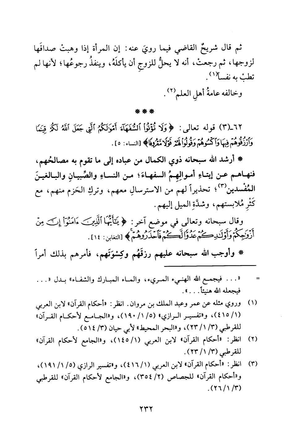 62 - (3) قوله تعالى: {وَلَا تُؤْتُوا السُّفَهَاءَ أَمْوَالَكُمُ الَّتِي جَعَلَ اللَّهُ لَكُمْ قِيَامًا وَارْزُقُوهُمْ فِيهَا وَاكْسُوهُمْ وَقُولُوا لَهُمْ قَوْلًا مَعْرُوفًا (5)} [النساء: 5].